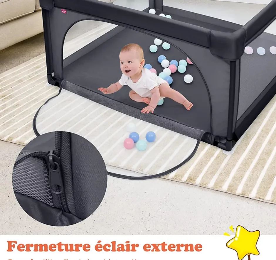 - Champ de vision ouvert: Le parc utilise un filet transparent respirant et la hauteur adaptée de 68 cm ne bloquera pas la vue. Le nourrisson garde une vue de l’extérieure à 360 degrés. Ce parc a 2 fermetures à glissière externe pour une entrée et une sortie faciles, dispose également d’une sécurité empêchant l’enfant de sortir depuis l’intérieur du parc.