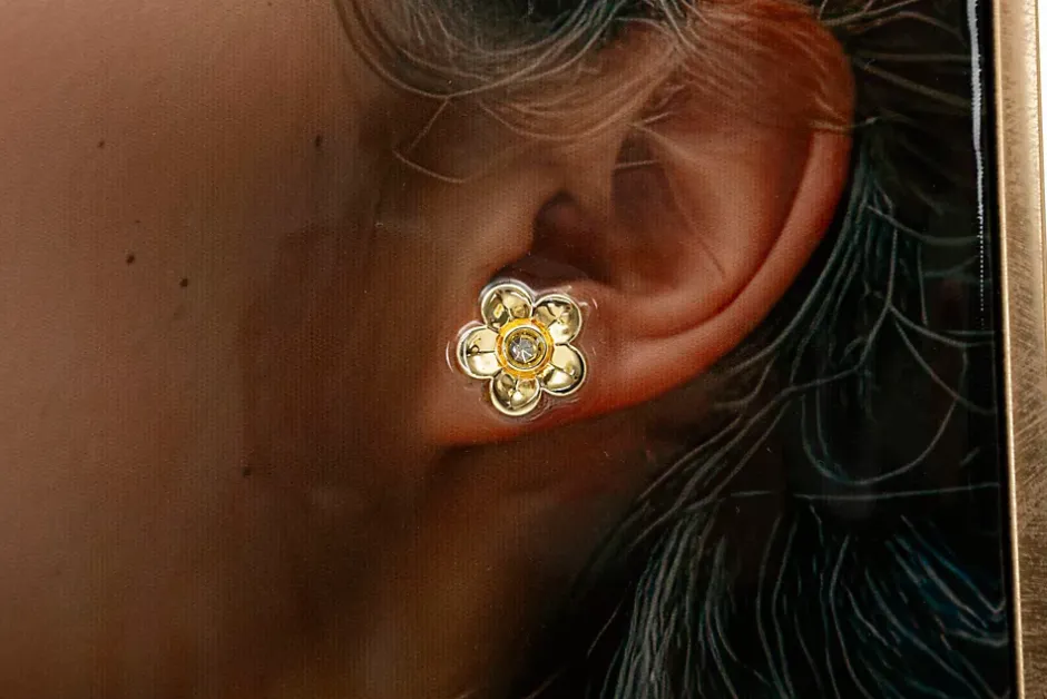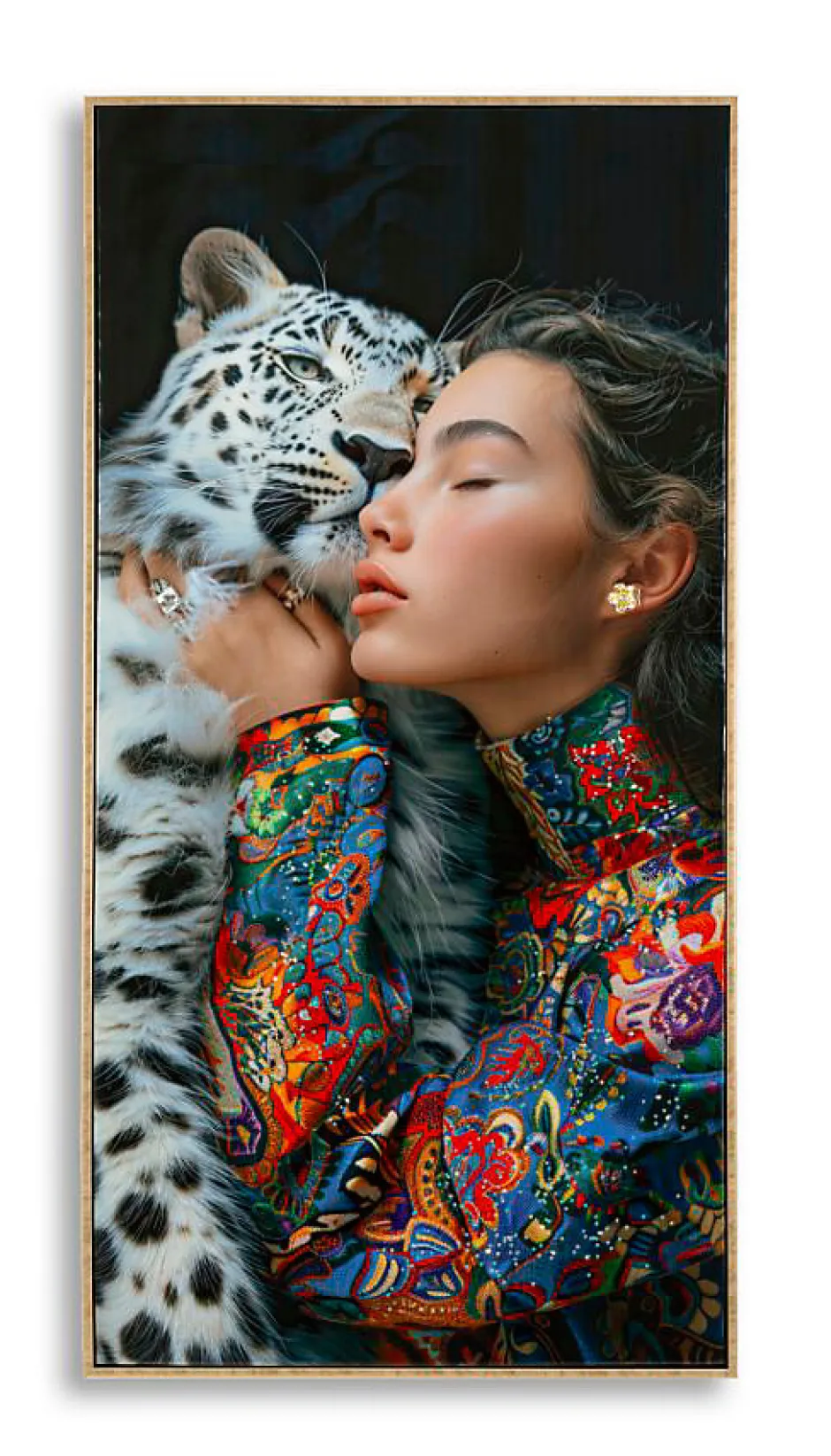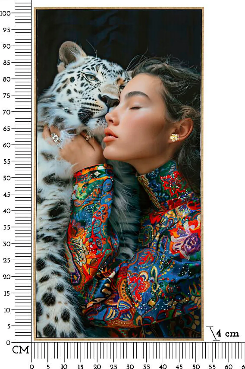 Peinture sur toile montée sur châssis en bois et cadre en métal doré, elle illustre la rencontre entre la délicatesse humaine et la puissance de la nature. Un tableau riche en détails, parfait pour créer des atmosphères chaleureuses, sophistiquées et uniques. Avec des applications en relief. Dimensions : 52 x 4 x 102 cm.
