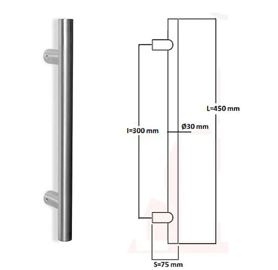 Poignée de tirage Professionnelle Diamètre 30 mm – Entraxe=300 mm – Longueur 450 mm -Hauteur 75 mm – en INOX 304 ( A2) Finition Polie. Livrée avec 2 fixations simples, traversants la porte et très facile à installer, composées de 2 tiges filetées en fer zinguée de longueur 52 mm x diamètre 8 mm, qui se visse sur une olive en Laiton, bloquée par une vis pointeau latérale dans le tube, M6 mm en inox, s’accouplant dans une bague en Inox, sertis dans le tube de la poignée, et 2 écrous et 2 rondelles.Produit en Italie. Sélectionné pour son excellence par HardwarExchange