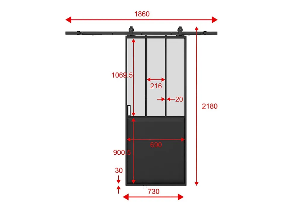 - Porte coulissante atelier en applique, dimensions : H205 x L73cm, MDF noir et verre trempé dépoli 4mm, rail aluminium, style industriel tendance, installation facile et rapide, ARTISTO II