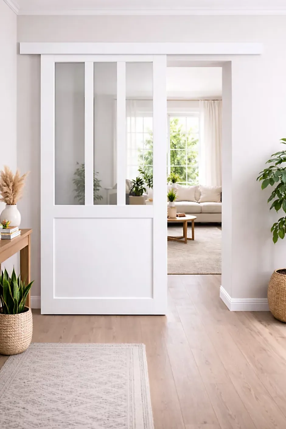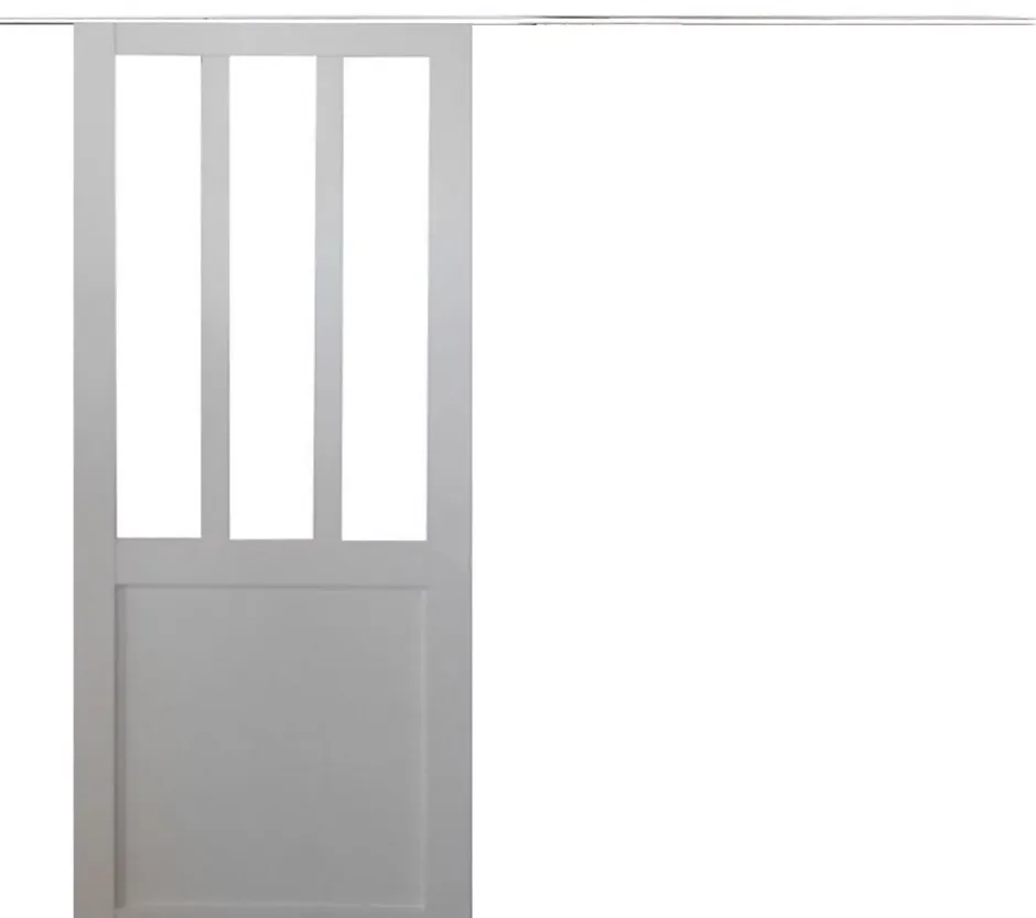 Porte coulissante Atelier blanc vitree H204 x L93 avec rail aluminium bandeau blancLa porte coulissante Atelier blanche vitree est ideale pour apporter luminosite et elegance a vos espaces interieurs tout en conservant un style atelier moderne et epure. Son vitrage transparent permet de laisser passer la lumiere naturelle tout en structurant les volumes avec finesse.Fabriquee en France, cette porte est conçue en MDF enrobe blanc et equipee d’un vitrage transparent de 4 mm, garantissant une finition soignee et durable. L’ouvrant affiche une epaisseur de 40 mm, assurant robustesse, stabilite et confort d’utilisation.Un rainurage en partie basse permet un guidage fluide et securise lors de l’ouverture coulissante. La porte est livree avec un rail en aluminium avec bandeau blanc, offrant une finition discrete et contemporaine.Le rail d’une longueur de 190 cm, recoupable, est fourni avec un cache rail en aluminium blanc, pour une integration harmonieuse dans votre interieur.Cette porte est destinee a une installation en interieur, dans un espace chauffe et isole, afin de preserver la qualite des materiaux et la durabilite du produit.
