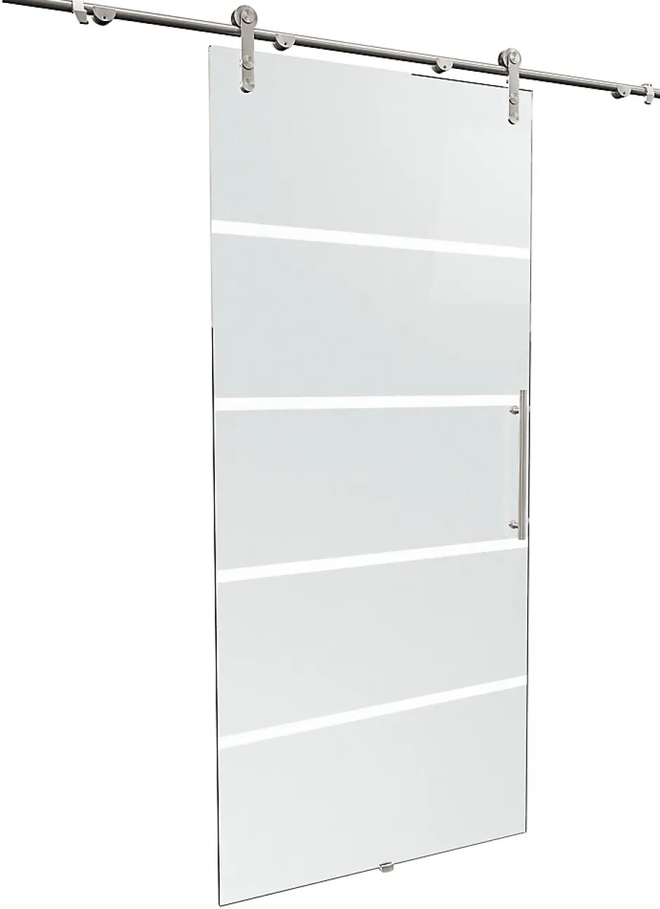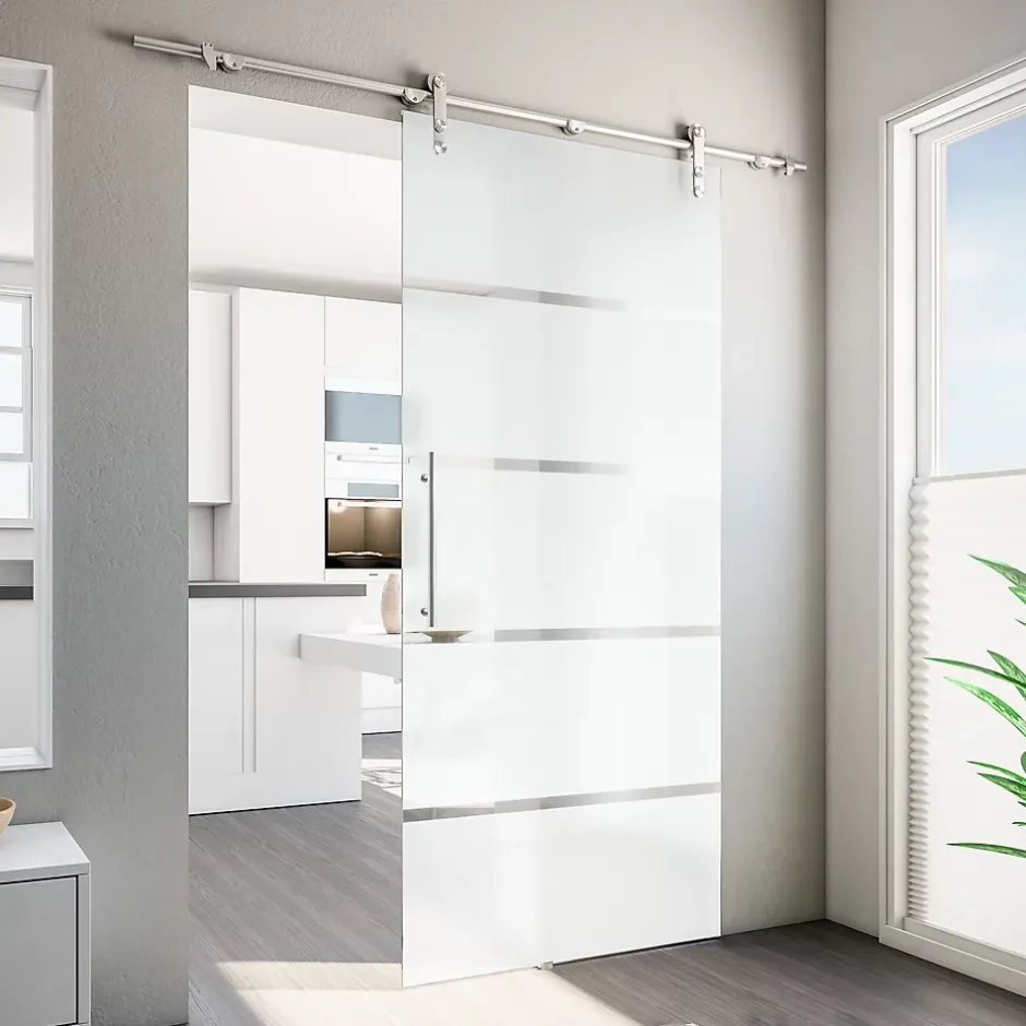 Élément décoratif et moderne à part entière, une porte intérieure coulissante sépare les pièces et crée une ambiance cocooning. Que ce soit à la maison ou au bureau, elle se pose partout, peu importe la taille et le style de votre espace. AVANTAGES PRODUIT :Solution gain de place: supprime la surface de dégagement d’une porteFacile : réaménager, agencer et décorer sans gros travaux de rénovationLiberté de mouvement: circulation plus fluide entre les pièces. Facilite les déplacements des personnes à mobilité réduiteSéparation de pièce: limite la propagation des odeurs de cuisine, divise une grande pièce en deuxÉconomie d’énergie: maintient la température dans les piècesSécurité: fini la porte qui claque lors d’un courant d’airParoi vitrée: laisse passer la lumière et donne une sensation de volumeMontage: possible au-dessus d’un encadrement de porte déjà existantSystème coulissant: particulièrement silencieuxSystème coulissant sur roulement à billes: ne nécessite aucun entretienMontage réversible : ouverture à droite ou à gaucheDo it yourself : notice détailléeGuidage au sol : empêche les oscillations / battements de la porte.Système à coller : pour éviter de percer le sol (avantage si chauffage au sol) DÉTAILS TECHNIQUES :Porte coulissante d’intérieur en verre, rail en acier inoxydable, 1 vantailSystème en applique peu encombrant. Coulisse devant le murParoi en verre de sécurité de 8 mm d’épaisseur, bords du verre polisLargeur : 900 mmHauteur : 2080 mmProfondeur : 47 mmLargeur passage maximal : jusqu’à 860 mmHauteur passage maximal : jusqu’à 2040 mmPoids : 41 kgRails de guidage, guidage au sol, poignées à visser (trous déjà pré-percés) inclusLargeur rail : 2000 mmRail de guidage en acier inoxydable Ø 25 mm avec ferrures de roulement visibles et butées en finition aspect inoxDistance entre porte et mur : 18 mmPorte avec trous de montageOuverture de la porte au choix à gauche ou à droite
