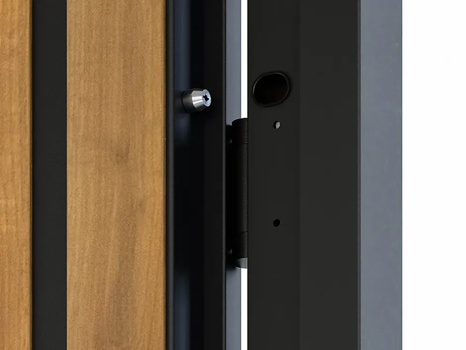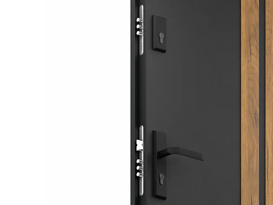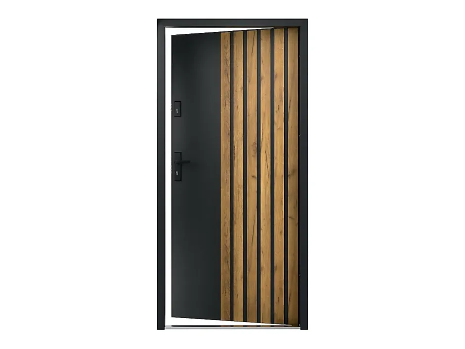 Vous souhaitez transformer votre entrée pour un design plus moderne ? La porte d’entrée en acier COBRITA allie un effet chêne naturel à des rayures noires pour un look unique. Son isolation thermique et acoustique assure confort et tranquillité, tandis que sa solidité vous garantit une sécurité maximale. Un choix parfait pour ceux qui recherchent à la fois esthétique et performance, cette porte donnera du caractère à votre maison tout en protégeant votre intérieur.Caractéristiques Couleur (nuance) : Noir Matière (précision) : Acier Type de porte : Porte simple Coefficient de résistance thermique : 1.5 Affaiblissement acoustique : 29 dB Equipement inclus : Poignée, Serrure à clé, Huisserie Nombre de jeux de clés : 6 Type de pose : en tunnel (ou en tableau) Sens d’ouverture : Poussant droit Utilisation : Extérieur Gamme : Good for Planet Produit : Fabriqué en Europe Livré monté (sauf pieds et/ou poignées) Hauteur du seuil : 20 mm Epaisseur du dormant : 110 mm Epaisseur de l’ouvrant : 55 mm Nombre de points de serrure : 2Dimensions Longueur : 95 cm Hauteur : 203.5 cm Profondeur : 9 cm Longueur hors tout : 100 cm Hauteur hors tout : 207 cm Profondeur hors tout : 11 cm Epaisseur de l’ouvrant : 55 mmLivraisonColisColis n°1 : Longueur 210 cm, Largeur 103 cm, Hauteur 13 cm, Poids 41 kg.