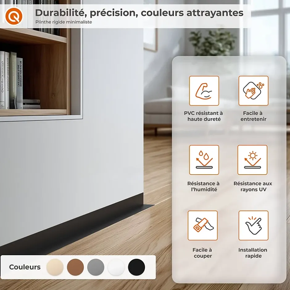 Plinthe PVC rigide pour intérieurs modernesLa plinthe en PVC est un détail qui définit le caractère d’un intérieur moderne. Sa forme géométrique et sa surface mate créent une transition propre et ordonnée entre le mur et le sol. La ligne subtile du profil sublime l’architecture de l’espace sans décoration superflue.Cette solution est particulièrement appréciée dans les projets de type loft, modern et industriel, où la simplicité et l’harmonie des matériaux sont essentielles. La plinthe s’accorde parfaitement avec le béton, le bois, le carrelage ou l’enduit texturé, tout en conservant une apparence technique et neutre.Plinthe minimaliste pour espaces résidentiels et commerciauxGrâce à la résistance du PVC et à sa facilité d’installation, la plinthe convient aussi bien aux espaces d’habitation qu’aux environnements commerciaux. Elle protège le bas du mur contre la saleté, les chocs et l’humidité, tout en conservant une esthétique cohérente avec le reste de l’intérieur.Où utiliser les plinthes modernes en PVC ?Dans des agencements loft et industriels. Une plinthe fine et mate crée un détail technique marqué qui souligne le caractère brut de l’espace.Dans des pièces humides. Grâce à sa résistance à l’humidité, elle convient parfaitement aux salles de bains, cuisines et couloirs en gardant sa forme et sa couleur.Dans des espaces commerciaux. Idéale pour les bureaux, boutiques et locaux de services – résistante à l’usage intensif et facile à nettoyer.