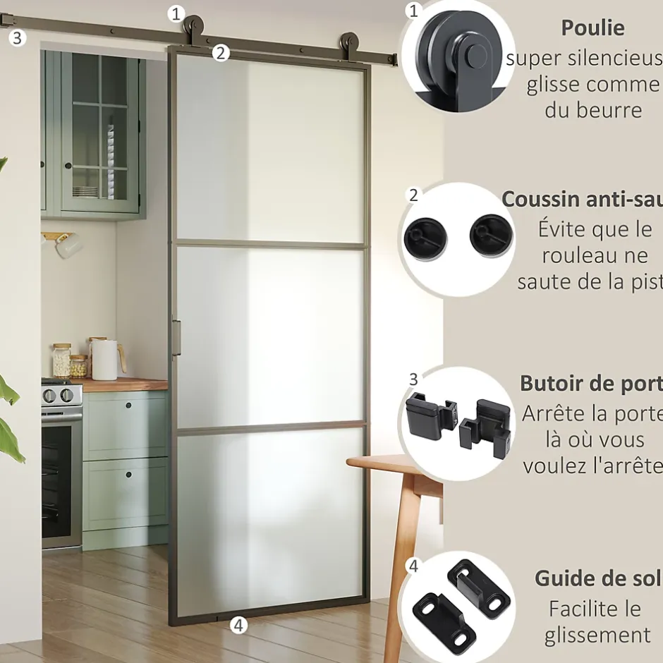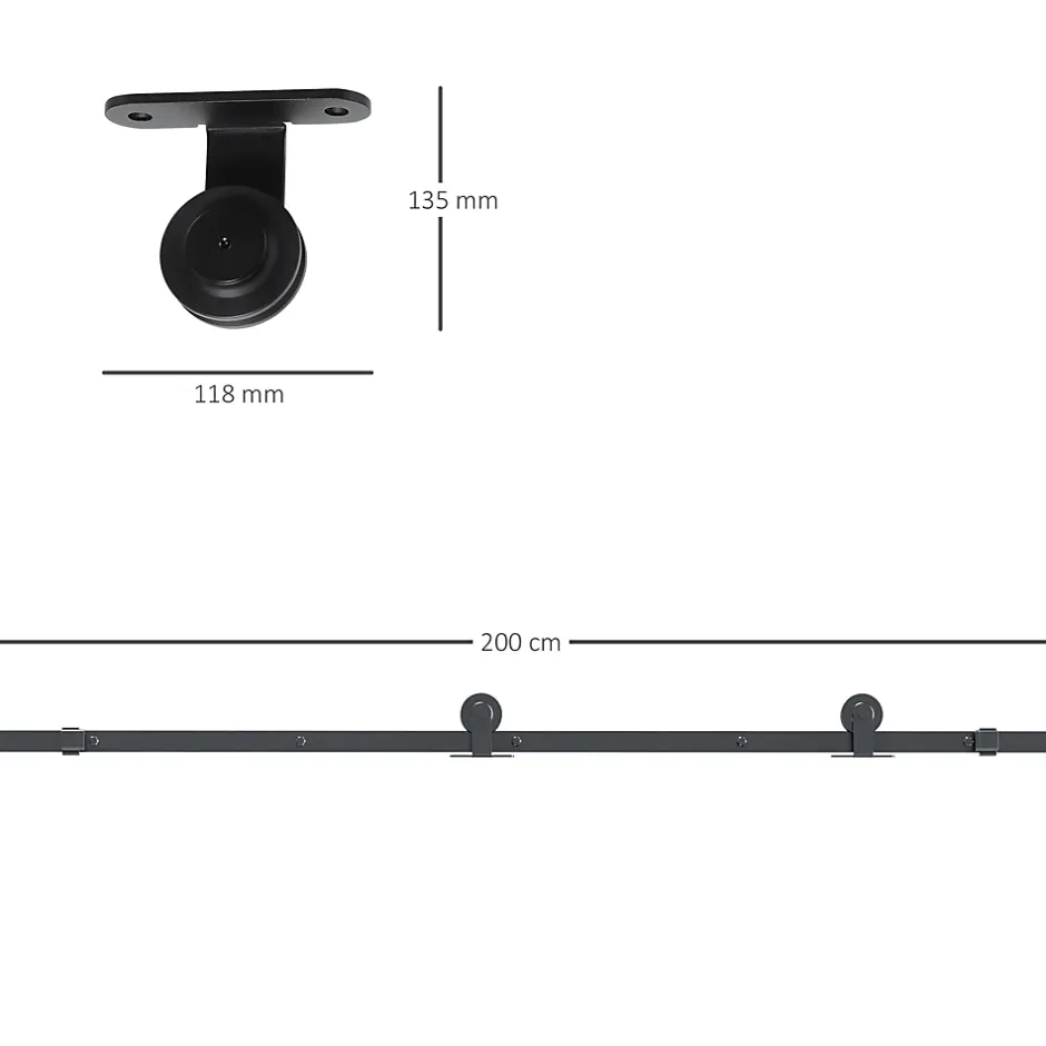 Découvrez notre kit de quincaillerie HOMCOM pour transformer une porte en un modèle moderne et pratique. Adaptable à divers espaces, de la chambre au salon, il est fabriqué en acier au carbone solide, supportant un poids important. Installation possible sur bois ou béton. Porte non incluse.Caractéristiques :- Transformez facilement l’aspect de votre maison avec ce kit de porte coulissante- Idéal pour les portes en bois communes, les portes en bois avec verre, entre autres- Design qui économise de l’espace, convient à la cuisine, la chambre, la salle de bain, etc.- Peut être utilisé sur des murs en bois ou en ciment, non recommandé pour des murs en mousse ou en brique creuse- Ce kit de rail pour porte coulissante en acier au carbone, supporte jusqu’à 100 kg- Les roues de qualité offrent un glissement doux et silencieux- Convient à des portes d’une épaisseur de 3,5-4,5 cm et d’une largeur maximale de 100 cm- Au-dessus de la porte, il doit y avoir un espace minimum de 12 cm- Le kit de porte coulissante est livré sans la porte, tous les accessoires de montage et le manuel d’instructions sont inclus pour une installation facileSpécifications :- Couleur : noir- Matériau : acier au carbone- Dimensions totales : 200L x 40l x 0,6H cm- Longueur du rail : 200 cm- Épaisseur de porte appropriée : 35-45 mm- Largeur de porte appropriée : maximum 100 cm- Charge max. recommandée : 100 kg- Réf. : B81-036V00BK
