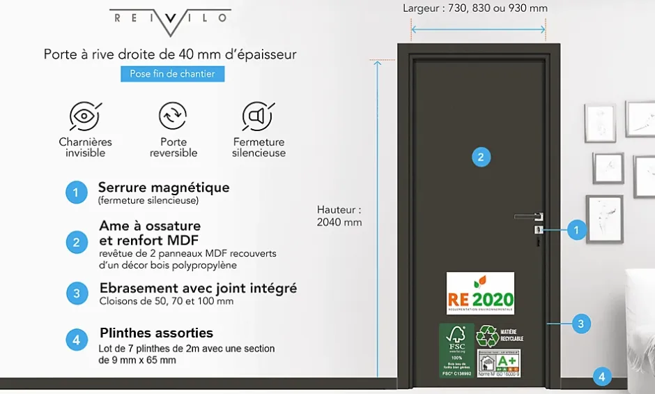 Caractéristiques du bloc-porte haut de gamme: couvre joint posé en coupe droite porte et ébrasement réversibles droite ou gauche pose fin de chantier sens d’ouverture définissable lors de l’installation et/ou modifiable à tout moment âme pleine avec panneau moussé : meilleur confort d’usage, stabilité accrue et amélioration notable de la qualité acoustique renfort MDF de type tubulaire (Medium Density Fiber), entretoise en MDF de 18 mm : les portes ne se déforment pas dans le temps revêtu de 2 panneaux MDF de forte épaisseur (parement de 6mm) : isolation thermique et acoustique supérieure à une porte alvéolaire (parement de 3 mm) à base de polypropylène : résistant aux UV matière , recyclable, imperméable, lavable, durable trous pré-percés pour une mise en place facile des vis traversantes pour le maintien de la poignée montage facile certification : 100% du bois issu de forêts durablement gérées émissions dans l’air intérieur : A+ Equipements inclus : serrure magnétique finition haut de gamme acier brossé verni : silencieuse et esthétique. Pêne constamment rétractée pour préserver le cadre. huisserie fin de chantier pour cloisons de 50 à 100 mm (adaptée au neuf et à la rénovation), assemblage mécanique (huisserie et porte démontables qui ne nécessitent pas de colle), pour tous types de cloisons briques ou placo, joint de confort acoustique charnière invisible finition acier brossé verni haut de gamme (sans gond apparent), plus esthétiques, conformité RE 2020 pour jeu jusqu’à 13 mm sous porte, à réglage tridimensionnel vis à double filetage pour une pose et un réglage rapide de l’huisserie (latitude de réglage complémentaire aux charnières) Poignée Exclusive intégrée grise Pour un parfait ancrage des charnières et du bâti : prévoir un tasseau bois vertical dans le rail avant la mise en place du placo prévoir un agglo hydrofuge de 19 mm en précadre dans la cloison brique ou parpaing Caractéristiques techniques: Largeur : 63 cm Hauteur : 204 cm A