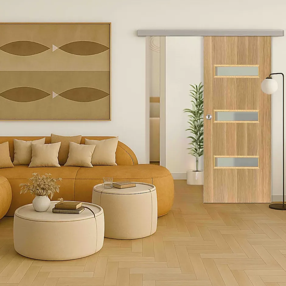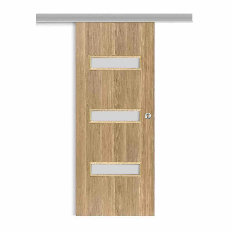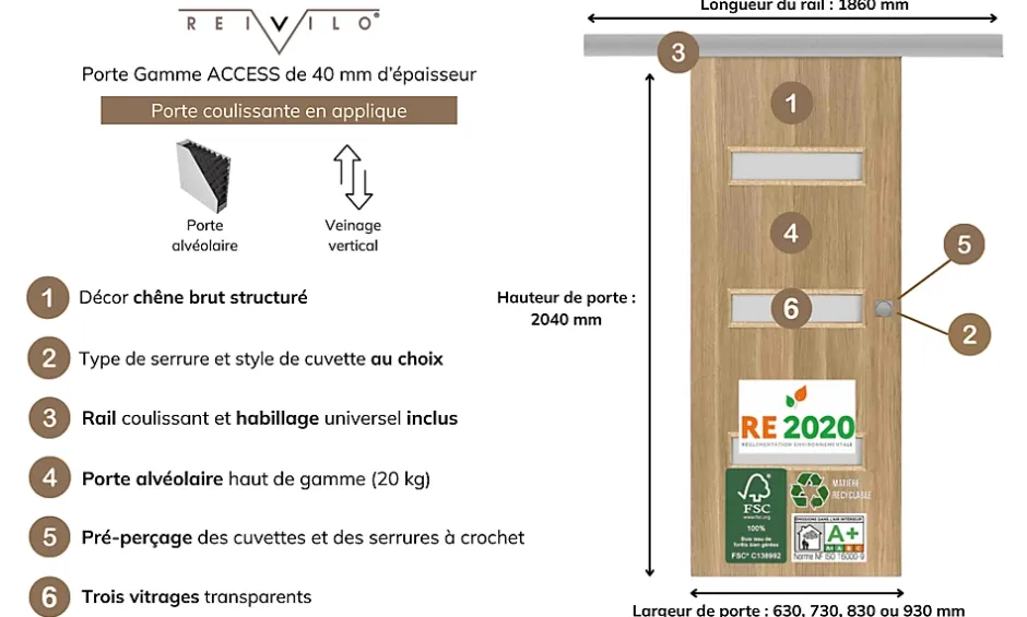 Voici les atouts de la porte coulissante applique April : finition aspect chêne brut structuré veinage vertical : alignement naturel avec le cadre et les couvre-joints, pour un rendu plus harmonieux et élégant pré-partagé des cuvettes et des serrures à crochet rainurage sous la porte porte alvéolaire haut de gamme (20 kg) 3 vitrages transparents pour laisser passer la lumière et gagner en perspective revêtement en CLPL (Continuous Low Pressure Laminate) : permet d’atteindre une combinaison idéale entre une adhérence parfaite aux contours et un effet naturel du revêtement certification : 100 % du bois est issu de forêts durablement gérées émissions dans l’air intérieur : A+ livrée avec un cache de propreté en argent brossé pour masquer l’usinage de la serrure à crochet habillage inclus rail coulissant inclus Caractéristiques techniques de la porte coulissante en applique April : serrure crochet cylindre ronde chromée (celle ci sera à monter sur la porte) rainurage de la largeur 5 x 15 mm sous porte à rive droite pour coulissant largeur 83 cm hauteur de porte : 204 cm poids porte seule : 27.65 kg poids colis complet : 39.30 kg