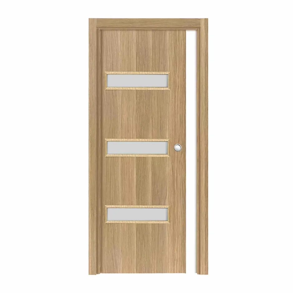 Voici les atouts de la porte coulissante à galandage April : finition aspect chêne brut structuré veinage vertical : alignement naturel avec le cadre et les couvre-joints, pour un rendu plus harmonieux et élégant pré-perçage des cuvettes et des serrures à crochet rainurage sous la porte porte alvéolaire haut de gamme (20 kg) 3 vitrages transparents pour laisser passer la lumière et gagner en perspective revêtement en CLPL (Continuous Low Pressure Laminate) : permet d’atteindre une combinaison idéale entre une adhérence parfaite aux contours et un effet naturel du revêtement certification : 100 % du bois est issu de forêts durablement gérées émissions dans l’air intérieur : A+ livrée avec un cache de propreté en argent brossé pour masquer l’usinage de la serrure à crochet habillage inclus Caractéristiques techniques de la porte coulissante à galandage April : serrure cuvette ronde chromée (celle-ci sera à monter sur la porte) rainurage de la largeur 5 x 15 mm sous porte à rive droite pour coulissant largeur 73 cm hauteur de porte : 204 cm poids porte seule : 24.80 kg poids colis complet : 36.23 kg