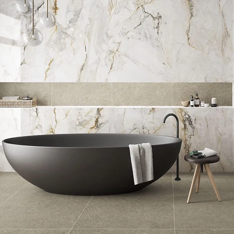 Le carrelage LUANDA brillant et poli est un choix moderne pour embellir votre intérieur. Avec ses dimensions de 90×90 cm, il offre une surface harmonieuse et élégante tout en minimisant les joints visibles. Sa finition brillante ajoute de la luminosité, rendant chaque pièce plus accueillante. Caractéristiques: – Dimensions : 90×90 cm – Épaisseur : Environ 9 mm, robuste et durable. – Bords rectifiés – Finition : Brillante & poli – Matériau : Porcelaine émaillée, facile à entretenir. – Poids : ~25 kg/m² – 1 Carton : 1,62 m² – 1 Palette : 43,74 m² / ~1100 kg Avantages: 1. Esthétique : Surface brillante pour plus de lumière et une touche de luxe. 2. Durabilité : Résiste aux chocs, rayures et usure. 3. Facilité d’entretien : Non poreux, résistant aux taches. 4. Polyvalence : Adapté aux styles résidentiels et commerciaux. Utilisations Recommandées: – Intérieur : Parfait pour salons, cuisines, salles de bains, halls. – Commerciaux : Idéal pour bureaux, boutiques et restaurants.