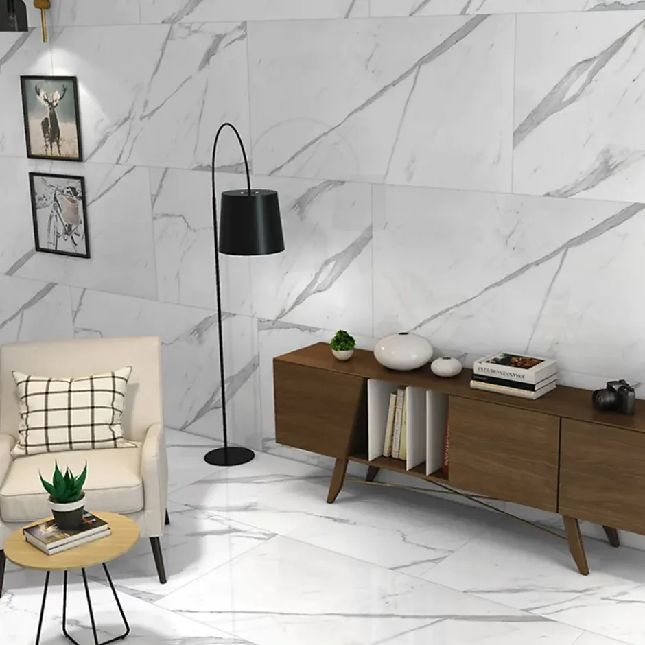 1 quantité dans votre panier = 1 carton de 2 carreaux de 60x120cm = 1,44m². Succombez par la beauté de ce carreau de carrelage blanc STATUARIO rectifié et brillant de taille 60x120cm en grès cérame. Il apportera à votre cuisine, salle de bain et séjour une élégance exceptionnelle. Il offrira un effet luxueux et sophistiqué à votre intérieur. Informations techniques: : – Carrelage certifié CE – Épaisseur : 9mm – Surface d’un carreau : 0,72m2 – Pose sur sol et mur – Joints conseillés entre 1 et 2 mm – 1 carton : 2 carreaux (1,44m2) / 29 kg – 1 palette: 46,08m2 / 32 cartons / 928 kg Facilité d’entretien: : Le carrelage est généralement facile à nettoyer et à entretenir. Il suffit de passer un chiffon humide ou d’utiliser un produit de nettoyage doux pour le garder propre et en bon état.Convient parfaitement pour les sols et les murs, en intérieur. Les bords rectifiés permettent d’appliquer des joints très fins entre 1 et 2 mm quasiment invisibles à l’œil nu. Le délai de livraison mentionné s’effectue en jours ouvrés, excluant les samedis, dimanches et jours fériés. : Le transporteur vous contactera pour convenir d’une date de rendez-vous. :