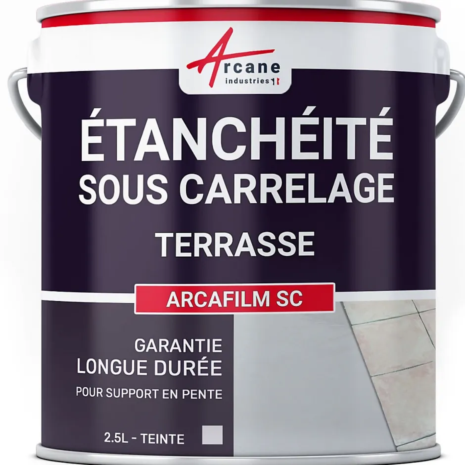 Résine d’étanchéité sous carrelage pour terrasse et balcon, ARCAFILM SC est un revêtement élastique pour support à pente non nulle. Elle garantit une étanchéité pérenne de vos terrasses carrelées.CONSOMMATIONEn moyenne, comptez une consommation totale (sous-couche + 2 couches pures) de 1.5 litres.Les applications peuvent être faites en deux, trois ou quatre couches successives en respectant les quantités totales au m² et les temps de séchage nécessaires entre chaque couche.Saupoudrage de silice HN31 : 2 kg / m²Exemple:Pour une surface de 10m²10 X 1.5= 15 litresSoit 1 bidon de 10 litres et 2 bidons de 2.5l et 20 kg de silice et 10 m² de fibre polyester Arcatissu.Il est nécessaire d’appliquer les quantités préconisées pour assurer l’efficacité du produit. Si vous n’arrivez pas à appliquer la quantité prévue en 3 couches, il faut augmenter le nombre de couches. Le plus important est de respecter la consommation prévue.Application : En tant que fabricant Français, nous mettons à disposition un document PDF disponible en bas de page vous indiquant les informations produits ainsi que les consignes d’application.La plateforme ne permet pas encore le regroupement des différents modèles. Pour voir toutes les contenances et toutes les couleurs, tapez ou copier-coller les termes suivants dans la barre de recherche : Résine d’étancheite sous carrelage extérieur pour support avec pente HAUTE DURABILITE – ARCAFILM SC