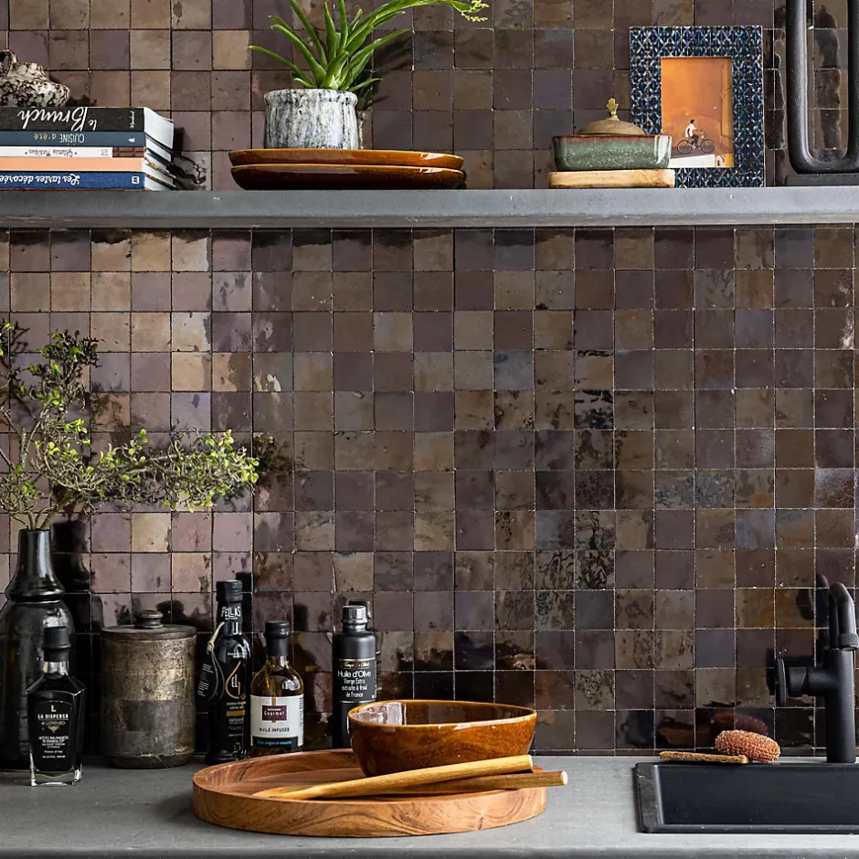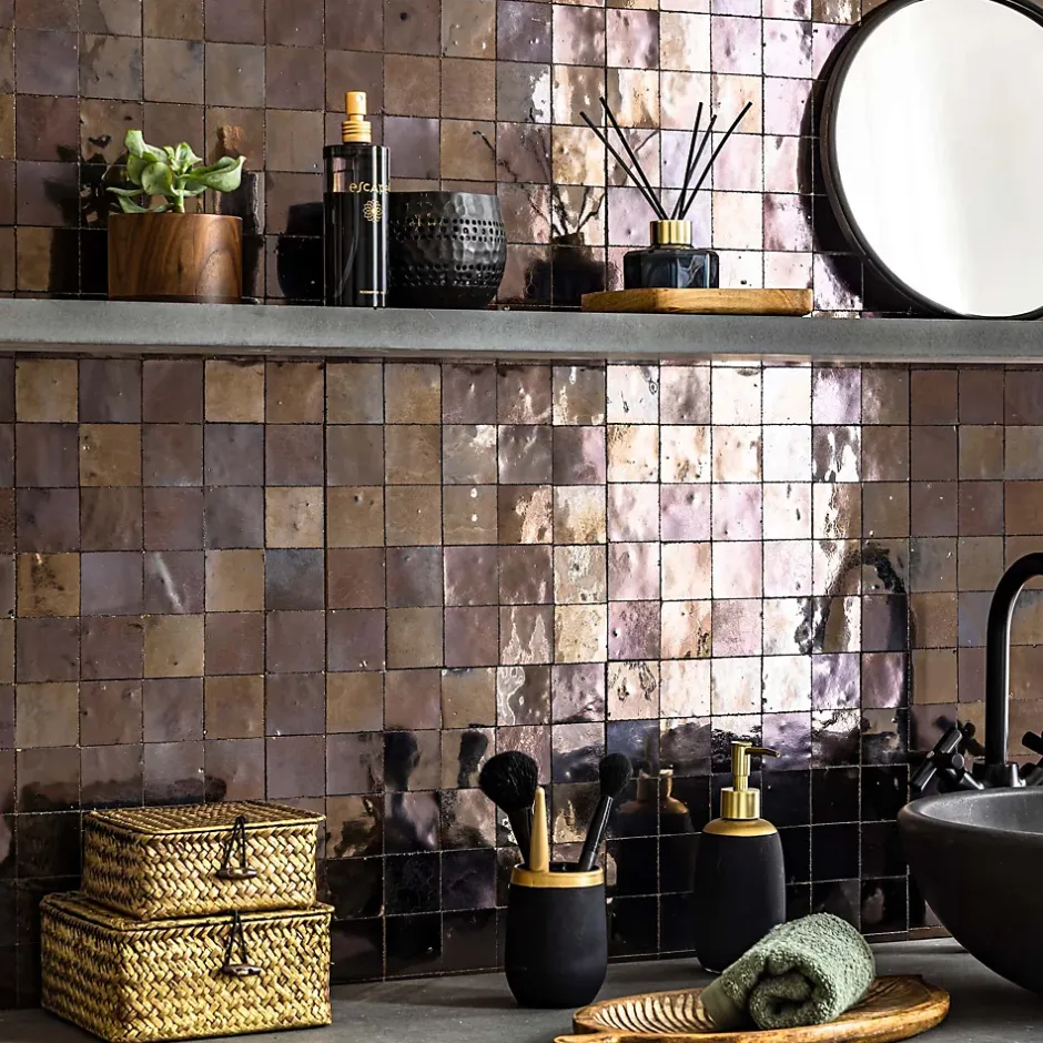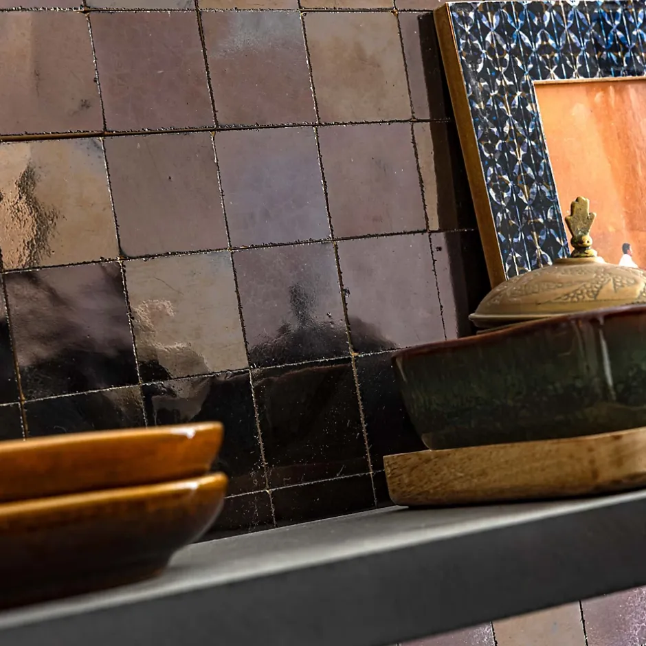 – DESCRIPTION -Cette mosaïque de Carrelage Zellige Marocain s’intégrera à la perfection dans vos aménagements de cuisine ou de salle de bains.Matière : Terre cuite émailléeCouleur : BronzeFormat des carreaux : 5×5 cm Format de la plaque : 30×30 cm Epaisseur : 1 cm Finition : Taillé mainOrigine : MarocUtilisation : Intérieur (Mur) Conditionnement : plaques de 30×30 cm soit 0,09 m²- INFORMATIONS -> Du fait de sa fabrication manuelle et artisanale, le zellige est par essence un revêtement imparfait. Les authentiques carreaux de zelliges marocains sont moulés, taillés et émaillés exclusivement à la main selon des méthodes traditionnelles ancestrales. Ces carreaux sont caractérisés par leurs irrégularités et leurs imperfections.Ces particularités purement esthétiques n’altèrent en rien les caractéristiques techniques des produits.En voici une liste non exhaustive :- Eclats sur l’émail ou dans les coins,- Bosses et irrégularités de planéité,- Creux ou trous pouvant laisser apparaitre l’argile,- Craquelures sur la surface de l’émail,- Révélation de l’argile à travers l’émail,- Variations de couleurs, de nuances et de tons,- Variations d’épaisseurs et de dimensions,- Sur trame : irrégularités d’espacements entre les pièces.> Si vous souhaitez un carrelage parfait : alors n’achetez pas de zellige authentique mais reportez vous sur de la céramique industrielle imitation zellige.> Nos photos sont réalisées par des professionnels avec l’objectif de représenter les produits de la façon la plus fidèle possible. Cependant, en fonction de votre écran et des paramètres appliqués, l’aspect et les couleurs du produit sur votre écran peuvent légèrement différer du produit original.- LIVRAISON -Forfait frais de port : tarif unique, sans limite de quantité. Avant vo
