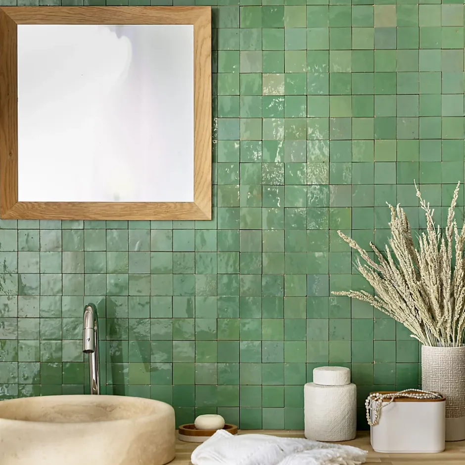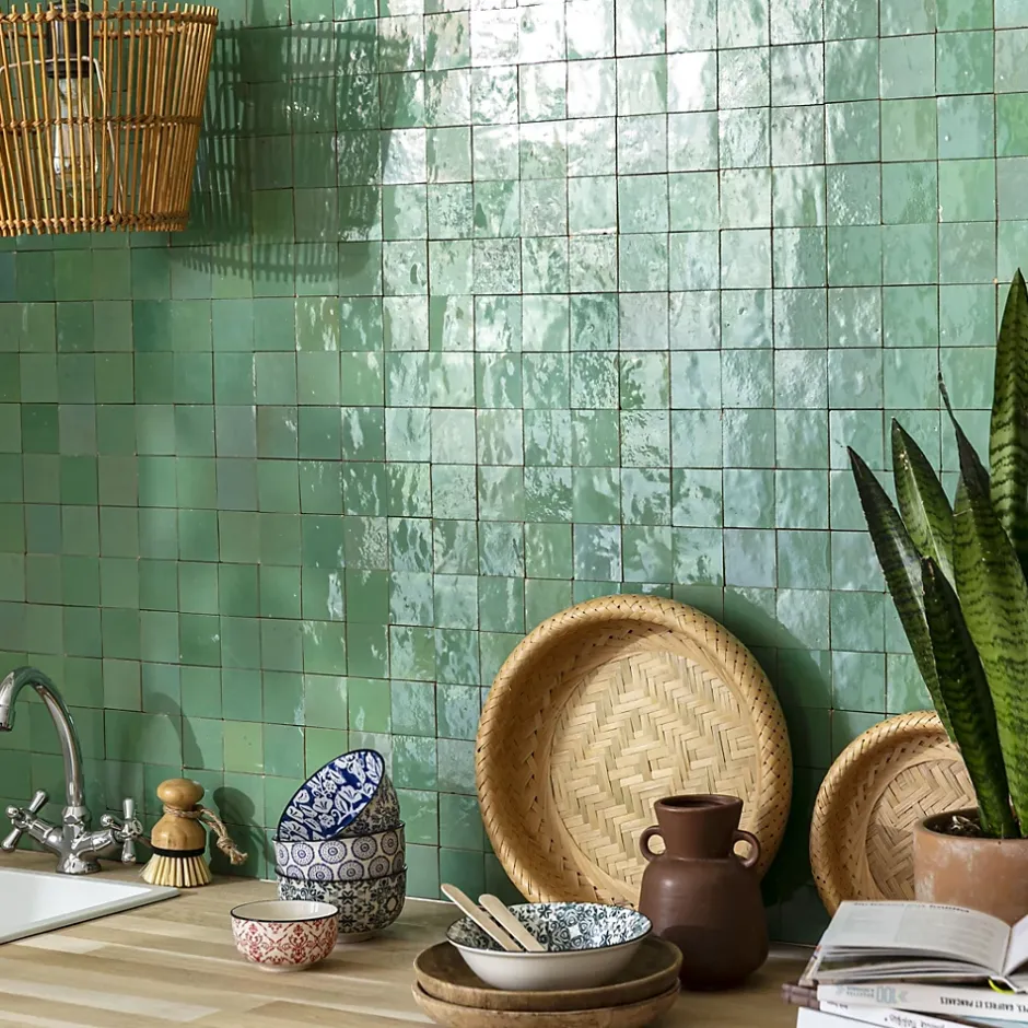 – DESCRIPTION -Cette mosaïque de Carrelage Zellige Marocain s’intégrera à la perfection dans vos aménagements de cuisine ou de salle de bains.Matière : Terre cuite émailléeCouleur : Vert d’eauFormat des carreaux : 5×5 cm Format de la plaque : 30×30 cm Epaisseur : 1 cm Finition : Taillé mainOrigine : MarocUtilisation : Intérieur (Mur) Conditionnement : plaques de 30×30 cm soit 0,09 m²- INFORMATIONS -> Du fait de sa fabrication manuelle et artisanale, le zellige est par essence un revêtement imparfait. Les authentiques carreaux de zelliges marocains sont moulés, taillés et émaillés exclusivement à la main selon des méthodes traditionnelles ancestrales. Ces carreaux sont caractérisés par leurs irrégularités et leurs imperfections.Ces particularités purement esthétiques n’altèrent en rien les caractéristiques techniques des produits.En voici une liste non exhaustive :- Eclats sur l’émail ou dans les coins,- Bosses et irrégularités de planéité,- Creux ou trous pouvant laisser apparaitre l’argile,- Craquelures sur la surface de l’émail,- Révélation de l’argile à travers l’émail,- Variations de couleurs, de nuances et de tons,- Variations d’épaisseurs et de dimensions,- Sur trame : irrégularités d’espacements entre les pièces.> Si vous souhaitez un carrelage parfait : alors n’achetez pas de zellige authentique mais reportez vous sur de la céramique industrielle imitation zellige.> Nos photos sont réalisées par des professionnels avec l’objectif de représenter les produits de la façon la plus fidèle possible. Cependant, en fonction de votre écran et des paramètres appliqués, l’aspect et les couleurs du produit sur votre écran peuvent légèrement différer du produit original.- LIVRAISON -Forfait frais de port : tarif unique, sans limite de quantité. Avan