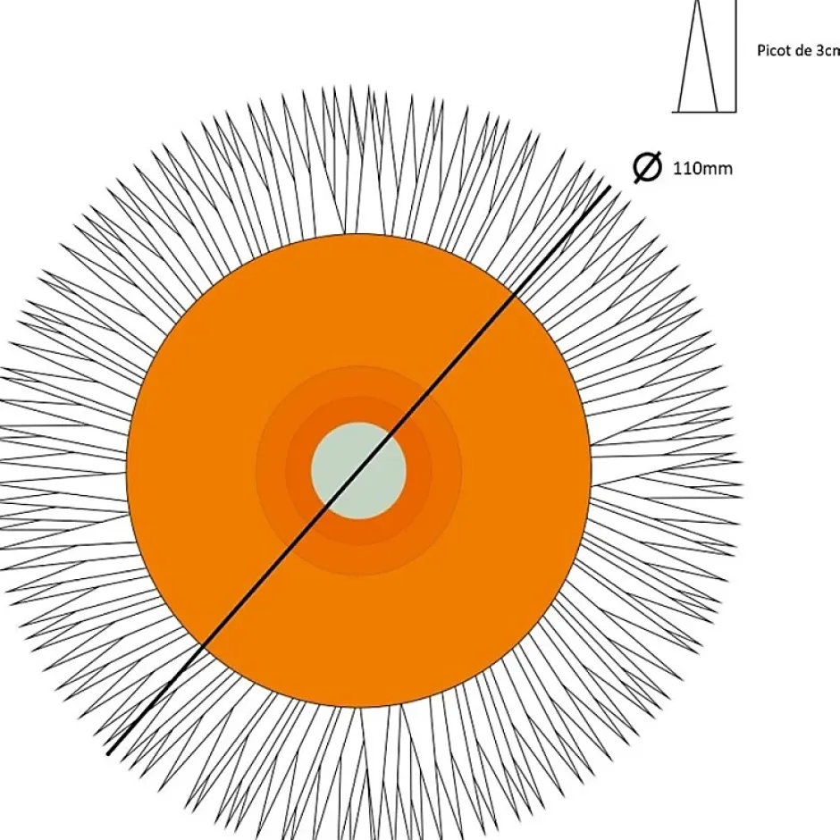 25 cm de large. Picots de 1 cm ou 3 cm. Livré avec sa monture.