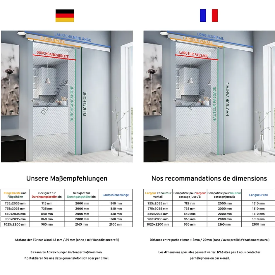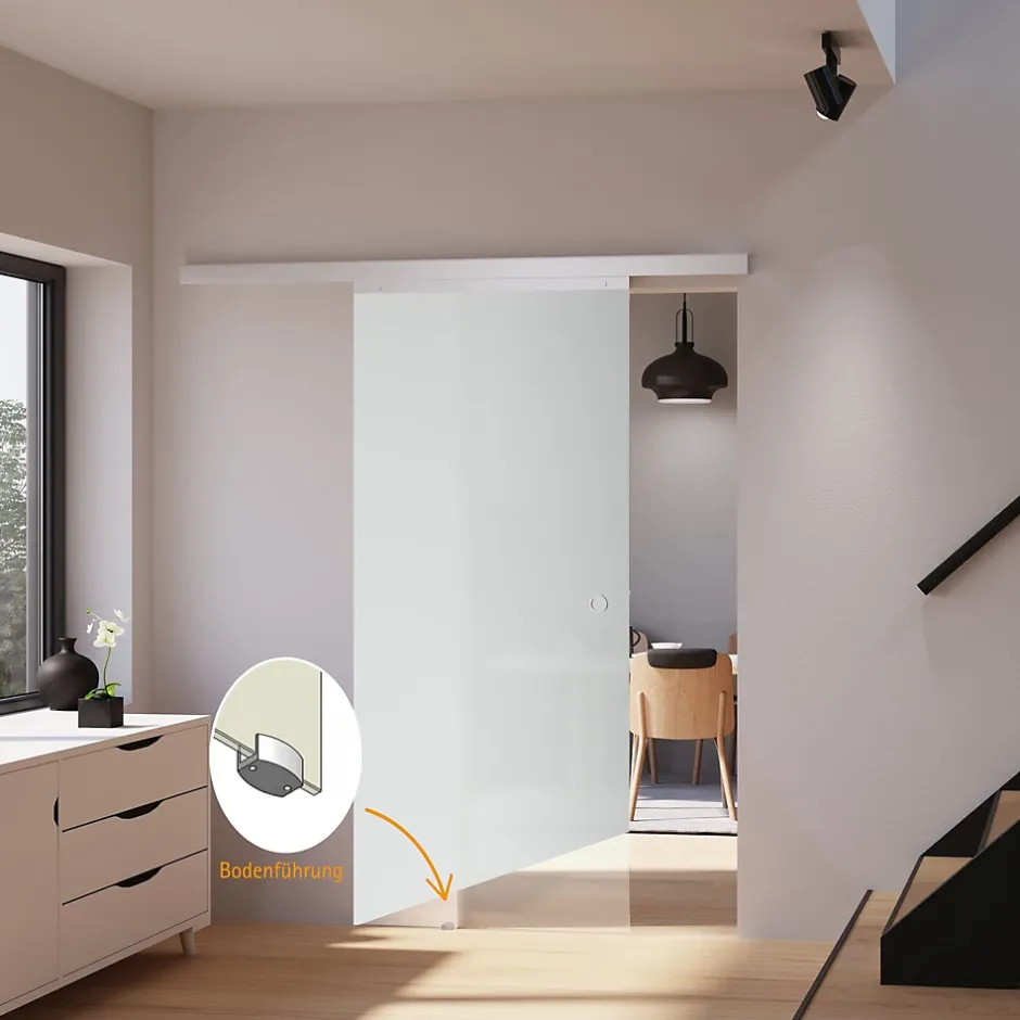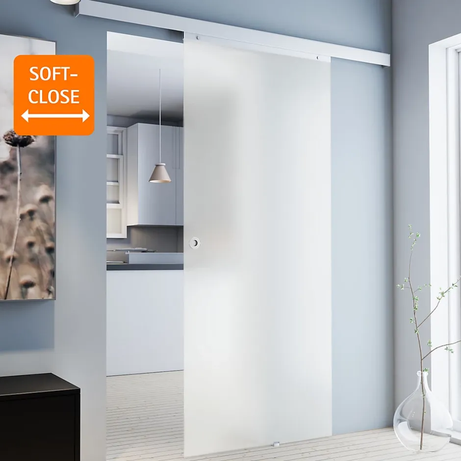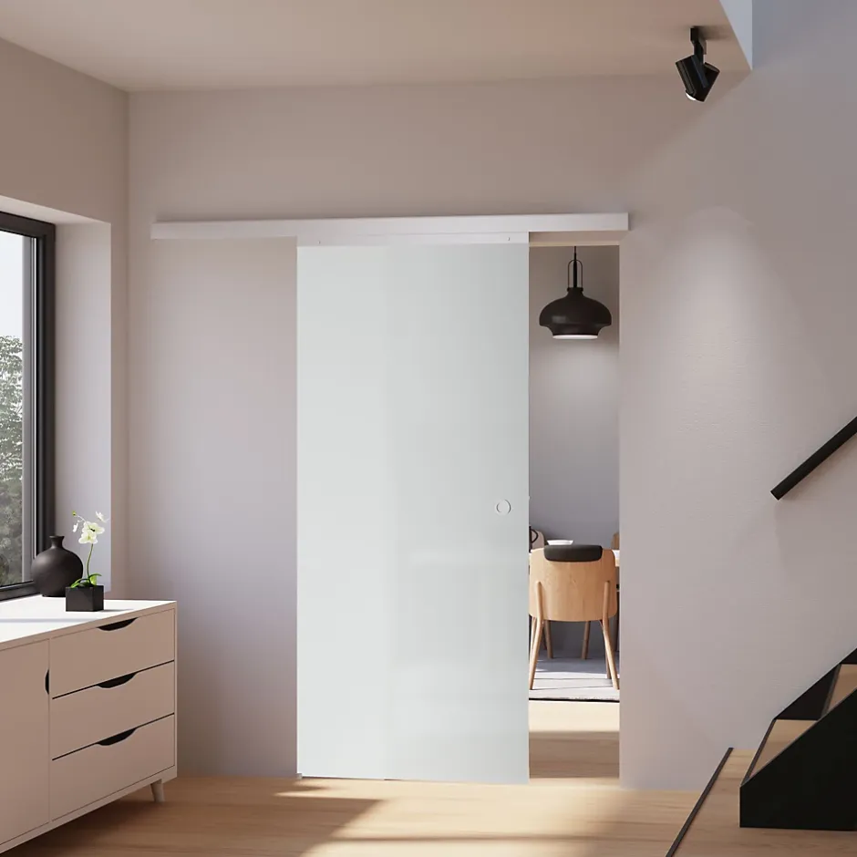 Élément décoratif et moderne à part entière, une porte intérieure coulissante sépare les pièces et crée une ambiance cocooning. Que ce soit à la maison ou au bureau, elle se pose partout, peu importe la taille et le style de votre espace. AVANTAGES :Solution gain de place: supprime la surface de dégagement d’une porteFacile : réaménager, agencer et décorer sans gros travaux de rénovationLiberté de mouvement: circulation plus fluide entre les pièces. Facilite les déplacements des personnes à mobilité réduiteSéparation de pièce: limite la propagation des odeurs de cuisine, divise une grande pièce en deuxÉconomie d’énergie: maintient la température dans les piècesSécurité: fini la porte qui claque lors d’un courant d’airParoi vitrée: laisse passer la lumière et donne une sensation de volumeMontage: possible au-dessus d’un encadrement de porte déjà existant grâce à une cale d’épaisseur incluse dans la livraisonSystème coulissant: particulièrement silencieuxSystème coulissant sur roulement à billes: ne nécessite aucun entretienPoignées autocollantes et ergonomiques : se pose à la hauteur souhaitéeMontage réversible : ouverture à droite ou à gaucheDo it yourself : notice détailléeGuidage au sol : empêche les oscillations / battements de la porte. DÉTAILS :Porte coulissante d’intérieur en verre sable, rail en aluminium inoxydable, 1 vantailSystème en applique peu encombrant. Coulisse devant le murParoi en verre de sécurité, bords du verre polisHauteur totale avec rail : 2260 mmLargeur passage maximal : jusqu’à 895 mmHauteur passage maximal : jusqu’à 2147 mmRail : 2100 × 36,5 × 34 mm | Cache : H60 mmLa cale d’épaisseur en aluminium inclus comble un écart allant jusqu’à 16 mm lorsqu’il y a un encadrement de porte déjà existant ou une plintheIntervalle porte / mur : 13 mm (sans cale d’épaisseur) – 29 mm (avec cale d’épaisseur)Porte avec trous de montageOuverture de la porte au choix à gauche ou à droiteButée d’arrêt double Softclose