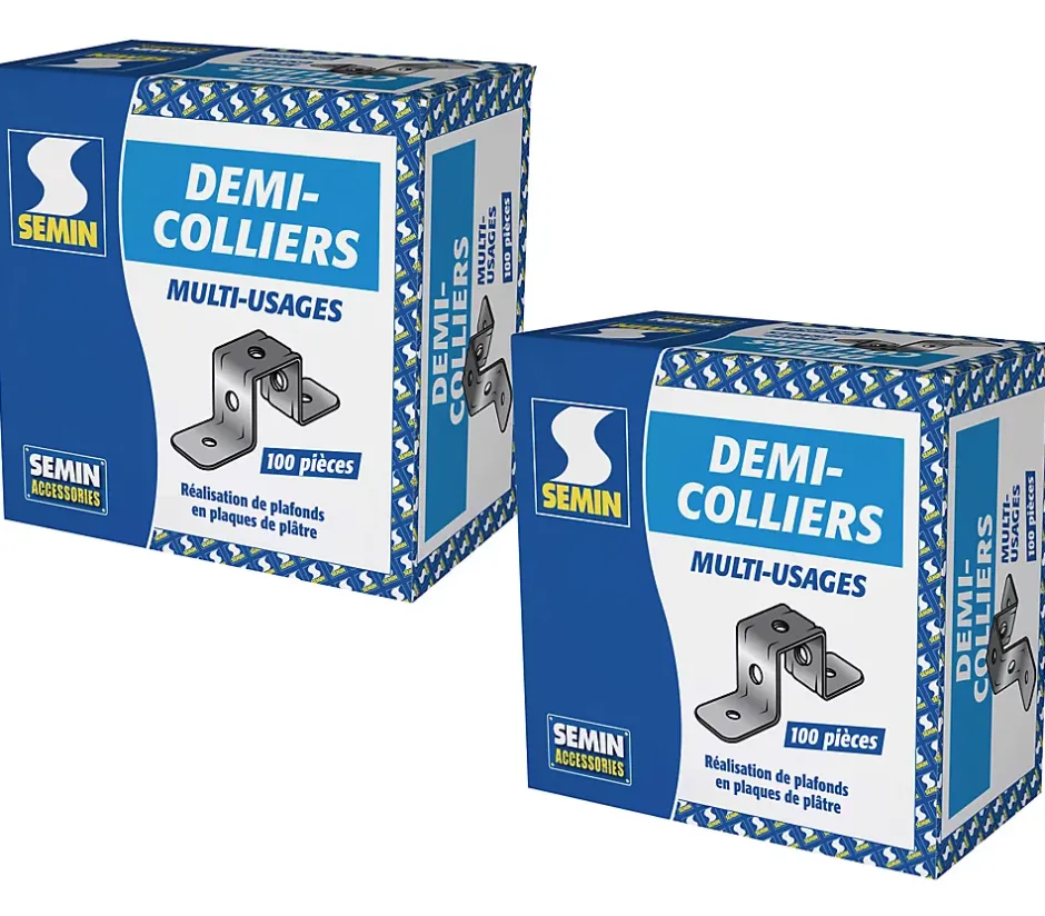 DEMI COLLIER DE FIXATION – POUR TIGE FILETÉE SUR PLAFOND BOIS OU BÉTONCe demi collier de fixation est l’accessoire idéal pour la pose de tiges filetées sur plafond en bois ou plafond béton.Solide, compact et simple à installer, il offre une solution de fixation professionnelle pour tous vos travaux de suspension de structures métalliques, plafonds suspendus, fourrures ou rails.Fabriqué en acier galvanisé, il assure une résistance à la corrosion durable et une réaction au feu de classe A1, pour un usage en intérieur sécurisé.Ce support est compatible avec toutes les tiges filetées standards du marché.Le demi-collier est prévu pour une tige filletée diamètre 6 mm.Ce pack contient :Demi Collier Multi-usages Semin, 2 boites de 100CARACTÉRISTIQUES TECHNIQUESMatériau : Acier galvanisé résistant à la corrosion Dimensions : 70 mm (L) x 30 mm (H) x 20 mm (l) Poids unitaire : 8 g Réaction feu : Classe A1 Conditionnement : 100 pièces – accessoires de fixation pour plafond suspendu GUIDE D’INSTALLATION1. Vissez le demi collier au plafond (béton ou bois). 2. Insérez la tige filetée dans le support. 3. Vissez le cavalier pivot. 4. Fixez la fourrure ou la structure métallique.
