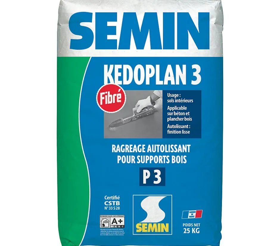 Enduit de ragréage autolissant pour la rénovation des planchers bois en sols intérieurs.Application en local sec, faiblement ou moyennement humide.Rattrapage des défauts de planéité et des irrégularités des supports.CARACTÉRISTIQUES TECHNIQUESDensité : Poudre : 1,1Mortier durci : 1,8CONDITIONNEMENTSac de 25 kg.COMPOSITIONMortier à base de ciments, sable, résine, fibres synthétiques et divers adjuvants.La pâte obtenue est de couleur rouge et à fort pouvoir autolissant.SUPPORT ADMISBéton et chape ciment poreux, béton et chape ciment normalement poreux, béton et chape ciment fermés, chape sèche à base de ciment, chape anydrite (sulfate de calcium), chape sèche à base de plâtre et dérivés, chape asphalte, carrelage, dalles platiques semi flexibles, traces de colle acrylique, néoprène, bitumineuse ou époxydique, panneaux bois, parquet à lames.STOCKAGESe conserve 12 mois dans son emballage d’origine fermé, sans contact avec le sol, dans un local sec, tempéré et faiblement ventilé.TAUX DE GÂCHAGE5.8 à 6.2L d’eau par sac de 25kg.CONSOMMATION1,5 kg/m² et par mm d’épaisseur.