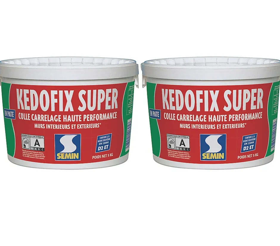 COLLE POUR CARRELAGE HAUTE PERFORMANCE KEDOFIX – SEAU DE 5 KGCollez avec confiance – même dans les conditions les plus exigeantesLa colle carrelage Kedofix Super est une solution prête à l’emploi conçue pour répondre aux exigences des professionnels et des bricoleurs avertis.Grâce à sa formule à base de résines acryliques haute performance, elle garantit une adhérence optimale dans les environnements les plus humides, comme les salles de bains, cuisines, ou douches collectives, et résiste parfaitement aux conditions extérieures.Ce pack contient :• Kedofix Super , 2 seaux de 5 kgPOLYVALENCE ET HAUTE ADHÉRENCEPour carrelage mural en intérieur et extérieur protégé Compatible avec une large gamme de revêtements : faïence, pâte de verre, pierre naturelle, grès, terre cuite, plaquettes de parement Application sur béton, plâtre, cloison légère, peinture adhérente, ancien carrelage…RÉSISTANCE À L’EAU RENFORCÉEConçue spécialement pour les locaux très humides de type EB+, cette colle assure une tenue durable même en présence d’humidité constante. Elle respecte les prescriptions du CPT du CSTB et est certifiée par le CSTB 20 AD 154.PRÊTE À L’EMPLOI – FACILE À APPLIQUERLa pâte prête à l’emploi permet une application directe sans mélange. Elle peut également être utilisée pour rattraper jusqu’à 5 mm de défaut de planéité avant collage (temps d’attente de 24h avant pose).CONSEIL DE POSEUtilisé en enduit, Kedofix super permet de rattraper de légers défauts de planimétrie du support. Dans ce cas, attendre 24 h avant le collage des carrelages.