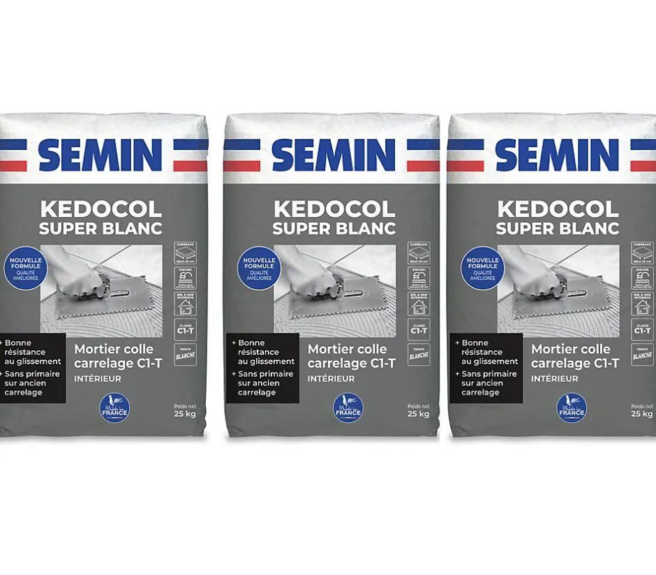 Mortier-colle traditionnel d’excellente qualité de classe 1, Kedocol Super Blanc est indiqué pour la pose de carrelages, céramiques, terre cuite, pâte de verre de formats traditionnels sur murs et sols en intérieur.Ce pack contient :• Mortier Colle pour Carrelage Kedocol Super Blanc Semin, 3 sacs de 25 kgREVETEMENTS• Grès pressé ou étiré• Terre cuite pressée ou étirée• Faïence• Pâte de verre• Plaquettes de parement• Pierres reconstituées, marbre (utiliser Kedocol super blanc)SUPPORTS ADMISMurs intérieurs :• Enduit ciment (2000 cm²)• Enduit au mortier bâtard (2000 cm²)• Plaques de plâtre (1200 cm²)Sols intérieurs :• Dalle béton (2000 cm²)• Chape ciment (2000 cm²)• Enduit de lissage autolissant (2000 cm²)DIMENSIONS DES CARREAUXLe poids des carreaux est limité à 40 kg/m².CONSOMMATIONLa consommation dépend du mode d’encollage et de l’outil d’application.En règle générale, la consommation est de :• En simple encollage, 2,5 kg/m²• En double encollage, 4 kg/m²CARACTERISTIQUES TECHNIQUES• Durée pratique d’utilisation : 4 heures• Temps ouvert : 20 mn• Délai d’ajustabilité : 20 mn• Délai d’attente avant jointoiement : 24 heures• Temps d’attente avant circulation : 24 heuresCONDITIONNEMENTSac de 25 kg.