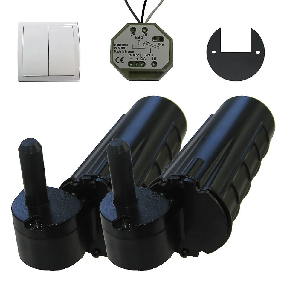 Double motorisation invisible Ø 12 mm pour volet battant Commande filaire avec interrupteur Pour 1 vantail droit (vu de l’extérieur) Poids max du vantail : 60 kg Fabriqué en France Garantie : 2 ans Quantité : 2 Attention : Volet non compris dans le kit, ni l’alimentation 24V, ni le kit résine. Double motorisation encastrée pour volet 1 battant droit URANUS filaire – gond Ø 12.Nos produits URANUS double motorisation sont à utiliser pour des volets de grande surface (voir spécifications techniques dans la notice de pose).Motorisez vos volets battants en toute discrétion, en préservant le cachet de votre façade, grâce au système innovant de gond motorisé encastré directement dans le mur.Les motorisations URANUS s’adaptent sur tous types de volets battants (bois, PVC, aluminium…), en neuf ou en rénovation.Associé à ce produit, nous recommandons l’utilisation de pentures d’épaisseur 5 mm minimum , en acier ou inox.Pour plus de détails, consultez la notice de pose. Spécifications à respecter : – Largeur du vantail : 30 cm min / 90 cm max- Surface max du vantail : 2 m²- Poids max du vantail : 60 kg- Distance min axe du gond / bord du volet : 30 mm- Épaisseur min penture (acier ou inox) : 5 mm Description : – Discret : un système de gond motorisé totalement invisible.- Sécurisant : détection d’obstacle selon la norme NF 26-341.- Souplesse d’utilisation : pilotez l’ouverture de l’ensemble ou une partie de vos volets.- Neuf ou rénovation : s’adapte sur tous types de volets battants y compris sur vantaux liés avec notre compas multivantaux. – Produit conçu et fabriqué dans nos ateliers en France, testé unitairement et garanti 2 ans. Contenu du kit : – 2 moteurs droits (vu de l’ext