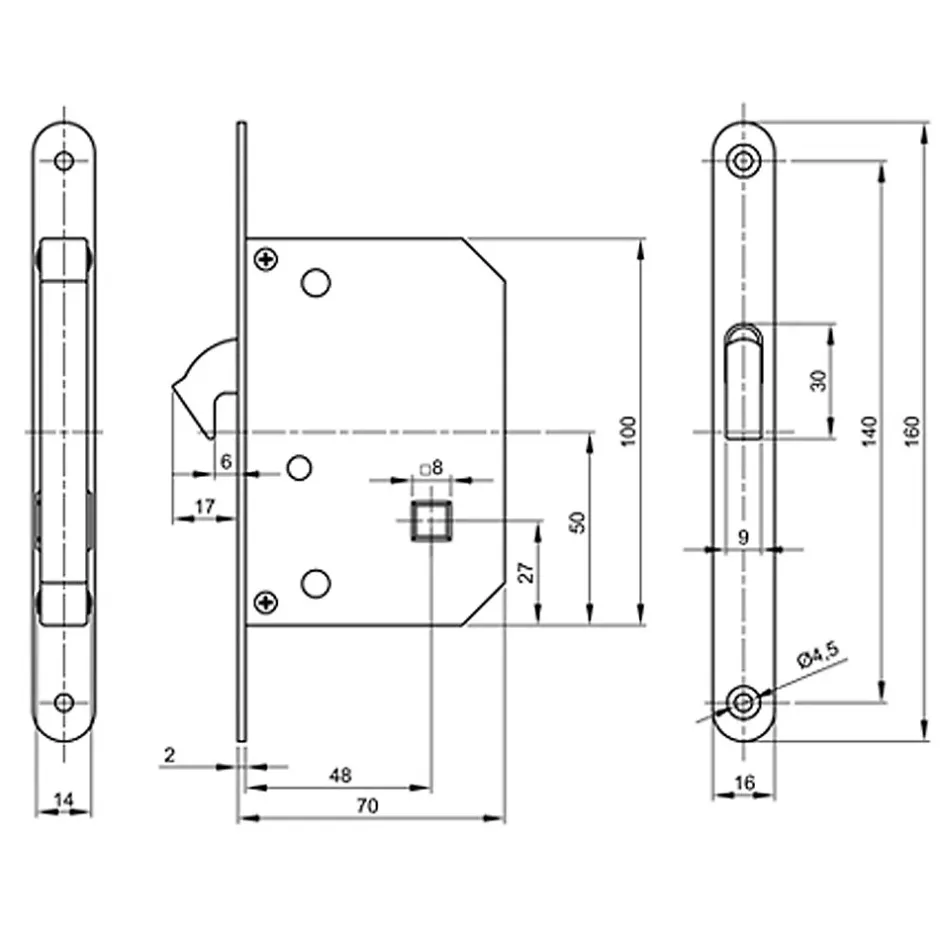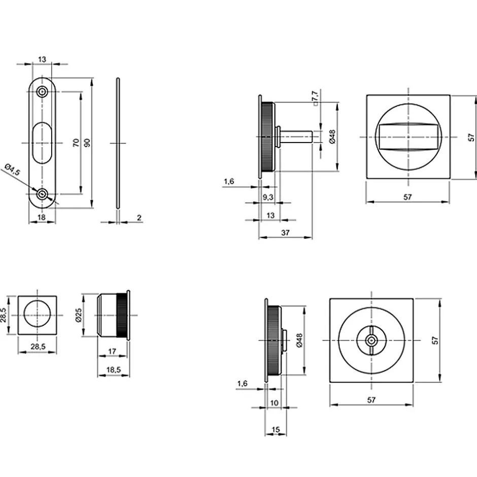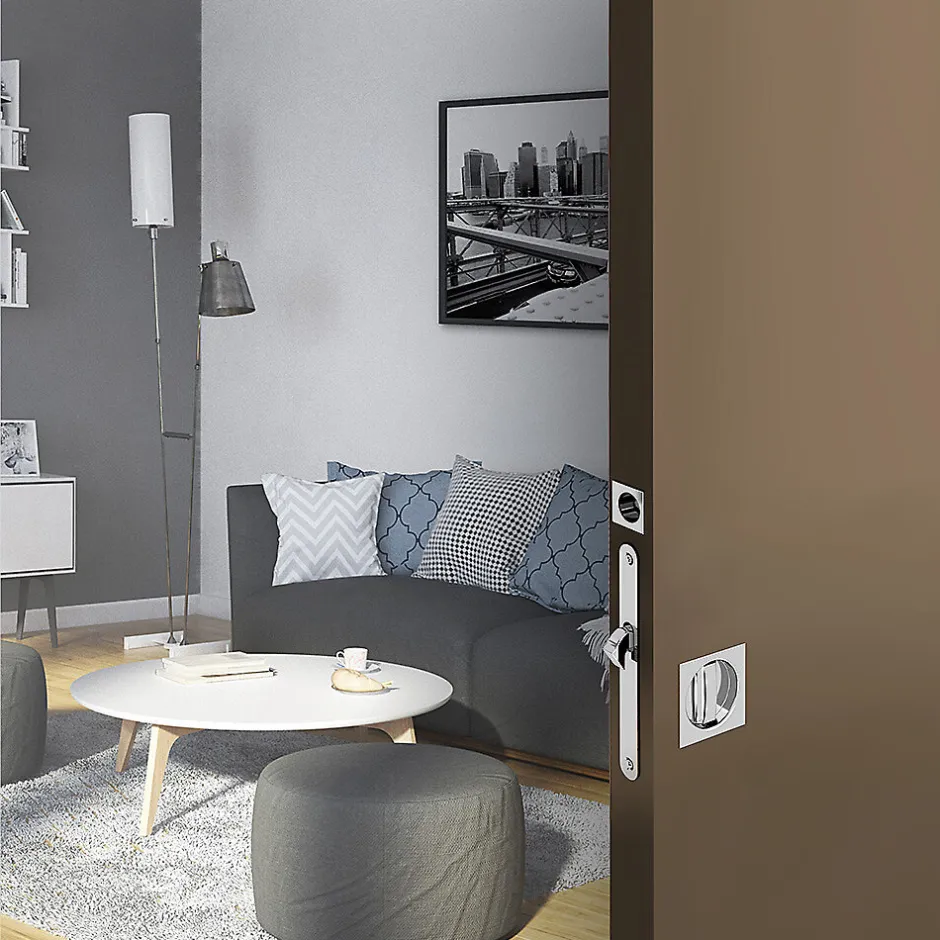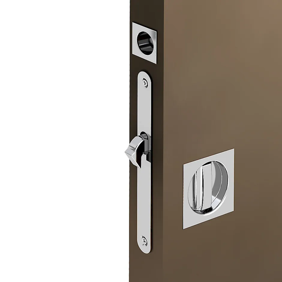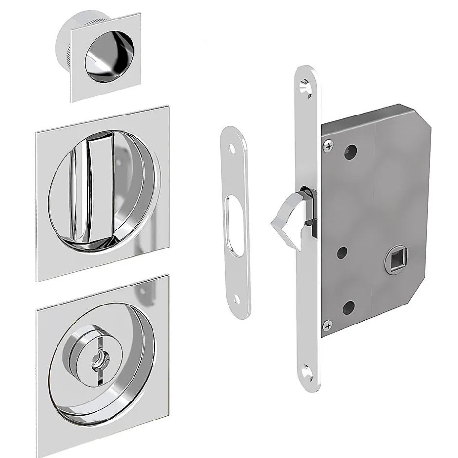 Poignée avec serrure à condamnation pour porte coulissante Serrure à crochet à encastrer Kit complet avec poignée carrée, tire-doigt et serrure En acier finition chromé Garantie : 5 ans Quantité : 1 Serrure à crochet à encastrer avec poignées carrées et tire-doigt pour porte coulissante.Poignées-verrou idéales pour une porte de WC ou de salle de bains.Pour porte d’épaisseur 40 mm.En acier finition chromé.Le crochet s’accroche sur la gâche fournie.Les poignées s’installent des deux côtés de la porte coulissante.L’installation du tire-doigt sur la tranche de la porte permet d’attraper la porte coulissante lorsque la poignée n’est plus accessible. Contenu du kit : – 1 poignée carrée avec système de condamnation, 57 x 57 mm- 1 poignée carrée avec déverrouillage d’urgence, 57 x 57 mm- 1 tire-doigt carré- 1 serrure à crochet- 1 gâche- 1 lot de visserie