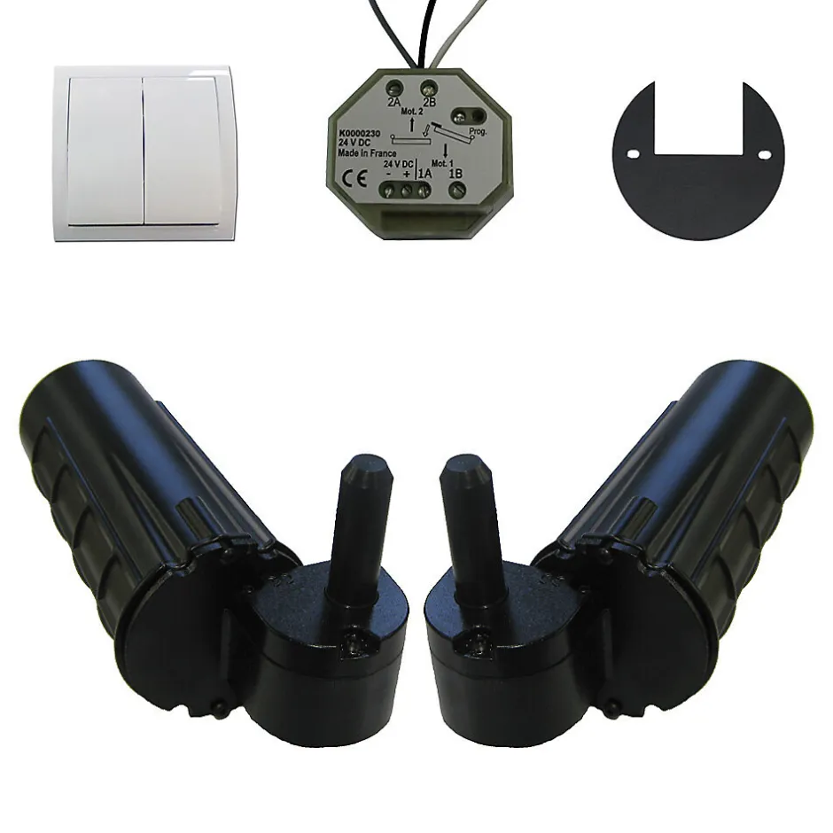Motorisation invisible Ø 14 mm pour volet battant Commande filaire avec interrupteur Pour 2 vantaux gauche et droite Poids max du vantail : 50 kg Fabriqué en France Garantie : 2 ans Quantité : 2 Attention : Volet non compris dans le kit, ni l’alimentation 24V, ni le kit résine. Motorisation encastrée pour volets 2 battants URANUS filaire – gond Ø 14.Motorisez vos volets battants en toute discrétion, en préservant le cachet de votre façade, grâce au système innovant de gond motorisé encastré directement dans le mur.Les motorisations URANUS s’adaptent sur tous types de volets battants (bois, PVC, aluminium…), en neuf ou en rénovation.Associé à ce produit, nous recommandons l’utilisation de pentures d’épaisseur 5 mm minimum , en acier ou inox.Pour plus de détails, consultez la notice de pose. Spécifications à respecter : – Largeur du vantail : 30 cm min / 80 cm max- Surface max du vantail : 1,6 m²- Poids max du vantail : 50 kg- Distance min axe du gond / bord du volet : 30 mm- Épaisseur min penture (acier ou inox) : 5 mm Description : – Discret : un système de gond motorisé totalement invisible.- Sécurisant : détection d’obstacle selon la norme NF 26-341.- Souplesse d’utilisation : pilotez l’ouverture de l’ensemble ou une partie de vos volets.- Neuf ou rénovation : s’adapte sur tous types de volets battants y compris sur vantaux liés avec notre compas multivantaux. – Produit conçu et fabriqué dans nos ateliers en France, testé unitairement et garanti 2 ans. Contenu du kit : – 2 moteurs (1 gauche et 1 droit, vu de l’extérieur)- 1 boîtier de commande- 1 interrupteur- 1 lot de visserie (vis, joint…)<img alt= »Nuancier RAL » src= »https://slidup.fr/img