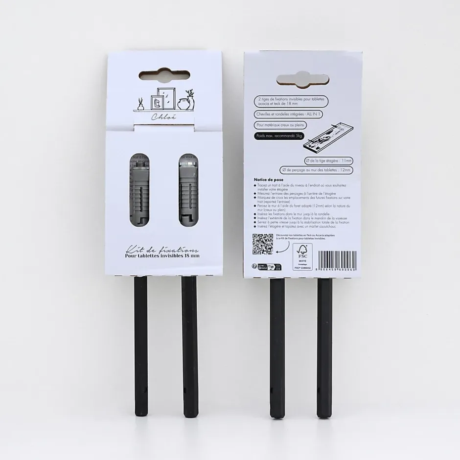 - CARACTÉRISTIQUES TECHNIQUES : Compatibilité : Tablettes Teck et Acacia 18 mm d’épaisseur Fixation : Invisible Matériaux : Métal et polyéthylène Capacité maximale : 5 kg Diamètre tige : 11 mm Perçage mural recommandé : 12 mm / profondeur 100 mm Accessoires inclus : Chevilles et rondelles pour tous types de murs