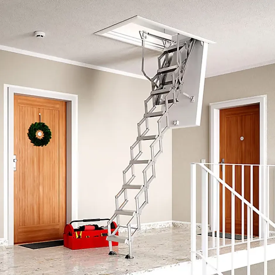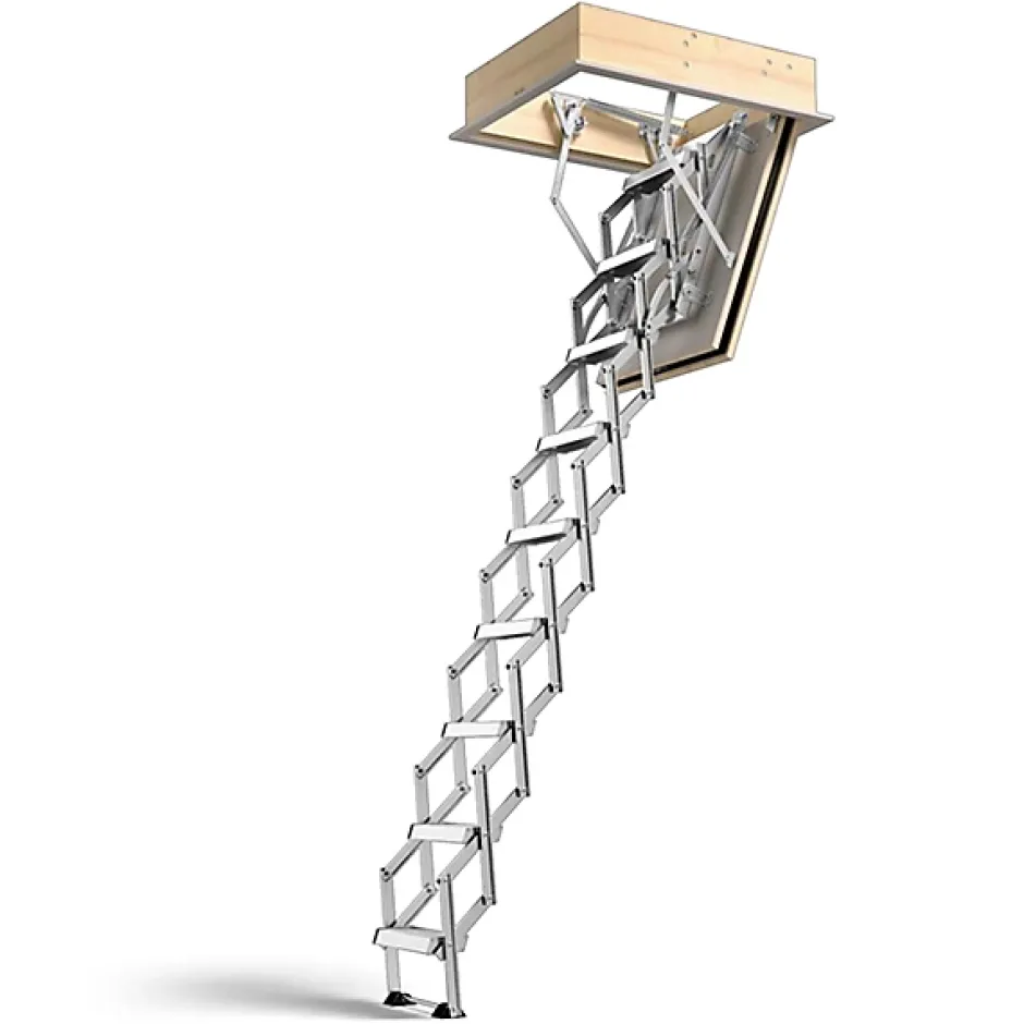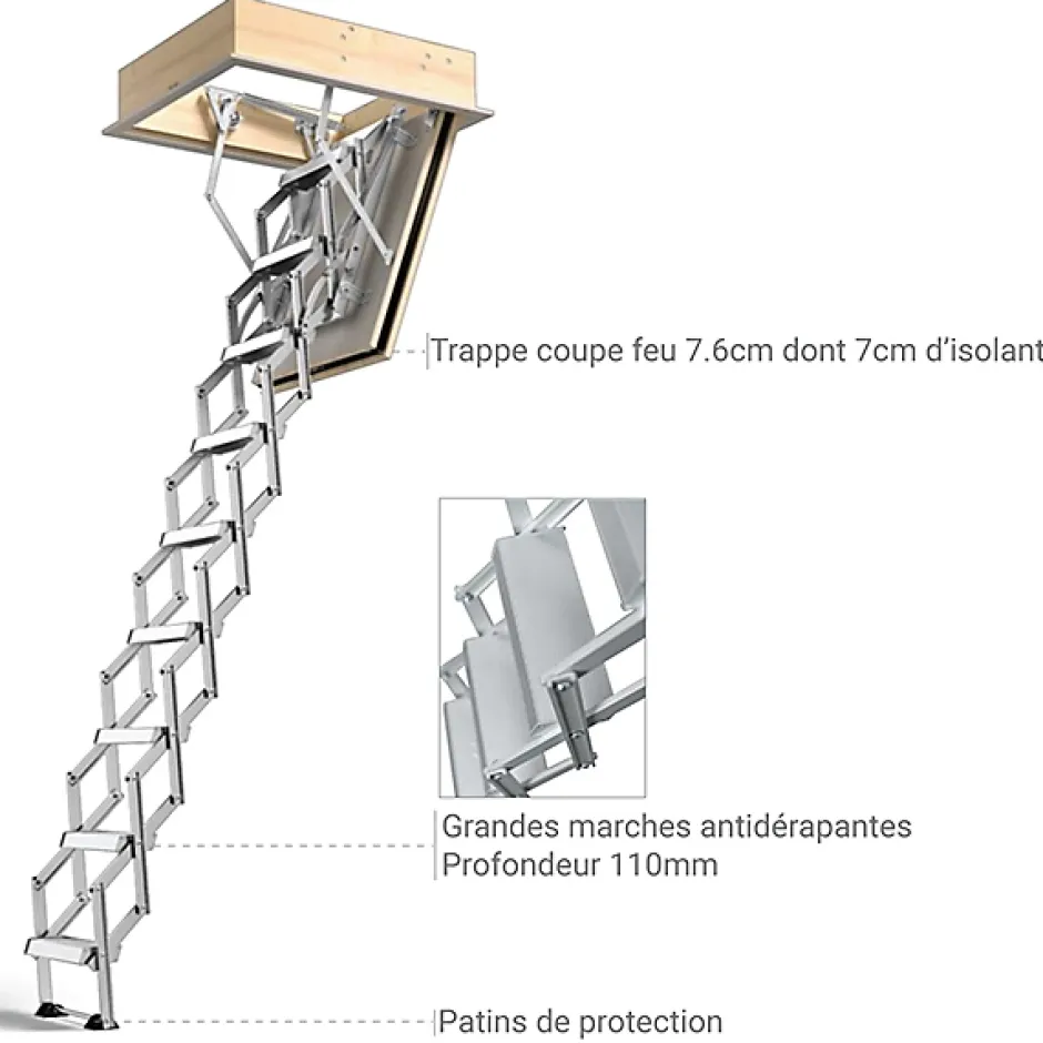 ACCES COMBLE- Matériel de sécurité-incendie pour les bâtiments industrielles, bureaux, logements collectifs, commerces- Limitation de la propagation du feu par l’isolement des combles- Equipement apprécié des menuisier, conducteurs de travaux, chefs de chantier, responsables techniques- Construction du bâtiment conforme au règlement sur la protection incendie des bâtiments- Respect de l’Euroclasses: classification européenne de réaction au feu des produits de la construction- Accès aux combles d’un bâtiment pour vérification et maintenance des conduits de fumée, installations électriques, appareils de ventilation ou climatisation.COUPE-FEU- Norme EI 60 pour une résistance de 60 minutes contre les flammes.- Joint gonflable intégré à la trappe qui augmente son volume afin d’éviter la propagation du feu à l’ensemble du logement.- Lutte contre les déperditions de chaleur: trappe isolante coeff. 0,94 W / m² K, épaisseur 7.6cm dont 7cm d’isolant.SECURITE ET CONFORT- Echelle équipée d’une main courante pour accompagner la montée et la descente. – Mécanisme d’allégement qui facilite l’ouverture et fermeture de l’échelle.- Charnière qui permet d’écarter l’échelle et la trappe pour un appui confortable du pied. – Patins de protection pour ne pas abîmer et rayer le parquet ou le carrelage.- Triple joint périphérique pour garantir une parfaite étanchéité.- 14 marches en métal antidérapantes d’une profondeur de 110mm- Manipulation de l’échelle sans risques grâce à la perche de manoeuvre.- Distance réduite entre la dernière marche et le plancher afin d’éviter les risques de chutes.CHOIX DE LA TREMIE- La trémie est l’ouverture dans le plafond qui sert d’accès au grenier- En cas de création, vous pouvez réaliser l’ouverture de votre choix : plus elle sera grande et plus vous pourrez passer avec des objets volumineux.- En cas de