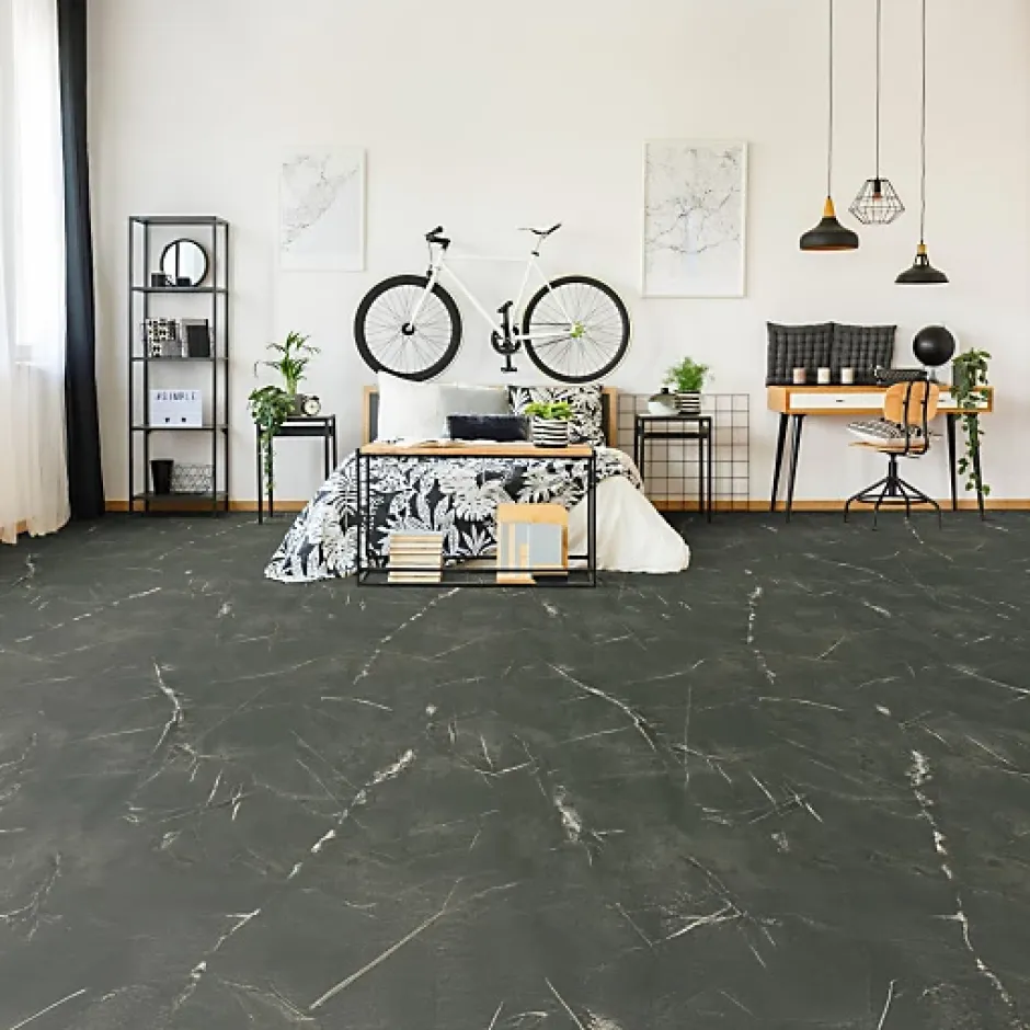 Sol vinyle à la surface mate offrant une protection améliorée contre les taches et les rayures.Son motif marbre noir, à la finition mate, sublimera votre intérieur avec élégance et s’adaptera à de nombreux style déco. Idéal pour toutes les pièces : salon, chambre, cuisine, salle de bain, bureau et couloir.Propriétés d’insonorisation remarquables, davantage de confort à la marche et anti-bruit.Nos sols PVC sont dotés de couches d’usure hautes performances qui les protègent contre les salissures et la poussière. Un peu d’eau suffira à les garder propres et hygiéniques toute leur vie, pas besoin de produits agressifs ou d’appareils gourmands en énergie.Nos sols PVC répondent aux exigences les plus strictes en termes de qualité de fabrication, d’hygiène et de sécurité, ainsi que d’environnement.- ASPECT : Mat- CHAUFFAGE PAR LE SOL : Oui- CLASSE COV : A+- CLASSEMENT EUROPÉEN : Usage Domestique – Classe 23 : Trafic intense (chambre, salon, hall d’entrée, salle à manger, couloir, salle de bain, cuisine, pièces avec accès sur l’extérieur), Usage Public et Commercial – Classe 31 : Trafic faible/intermittent (bureau individuel, chambre d’hôtel)- CLASSEMENT FEU : Cfl-s1 (ancienne norme M3)- CONDUCTIVITÉ THERMIQUE : 0,25 W/MK- COUCHE D’USURE : 0,25 mm- ÉPAISSEUR : 2,5 mm- FABRICATION : Européenne- ISOLATION PHONIQUE : 18 dB- POIDS : 1650 g/m²- RÉSISTANCE AU GLISSEMENT : R11- RÉSISTANCE CHIMIQUE : Très bonne- RÉSISTANCE THERMIQUE : 0,00104 m² K/W- TRAITEMENT DE SURFACE : PU• Tolérance sur la largeur et la longueur : ±3%IMPORTANT : Différences possibles de teinte entre rouleaux de largeurs différentes (2m, 3m, 4m). À considérer en cas de raccords. Évitez les tapis ou protections en caoutchouc/latex qui peuvent laisser des taches indélébiles. Privilégiez des protections en feutre pour les pieds de meubles.