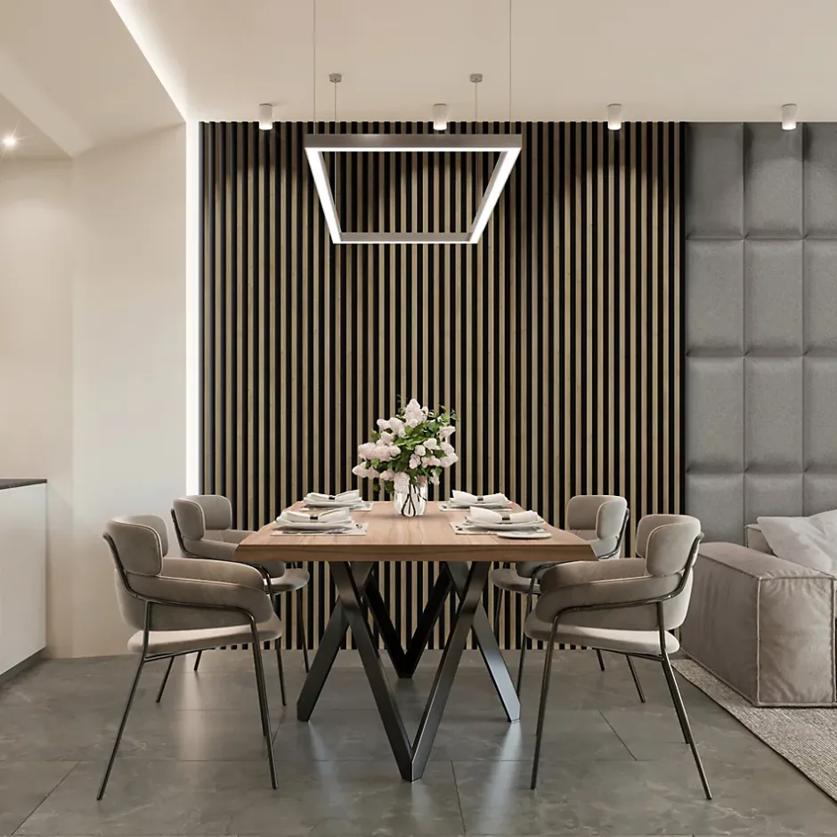 - Les lamelles améliorent l’acoustique de l’intérieur : la réverbération est éliminée, ce qui rend l’intérieur plus calme et très confortable