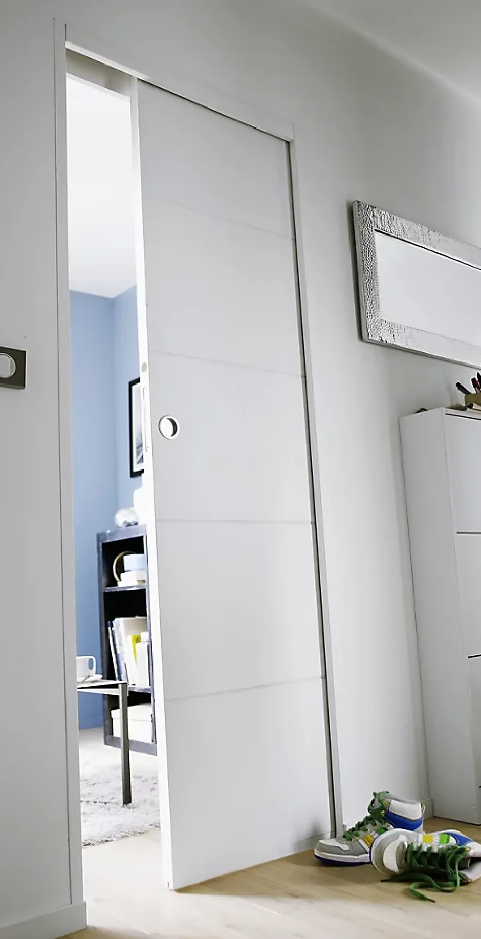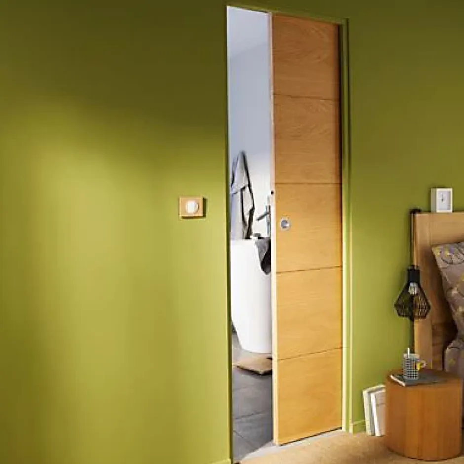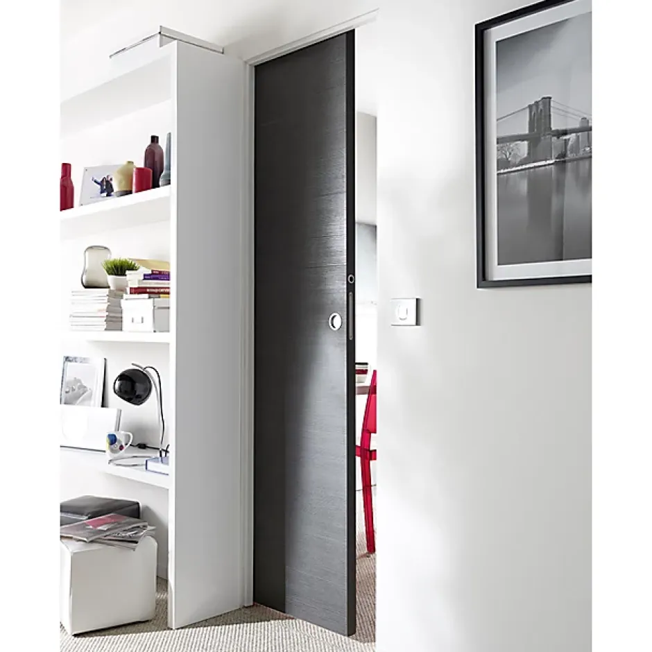 Création ou rénovation de pièce, Le système à galandage représente la solution la plus aboutie pour gagner de la place. Son cadre spécifique se place entre les murs et se recouvre (généralement de plaques de plâtres). La porte disparait dans le mur, l’aménagement de la pièce est plus simple. Le gain de place est de minimum 1M2 par rapport a une porte battante. Esthétique parfait