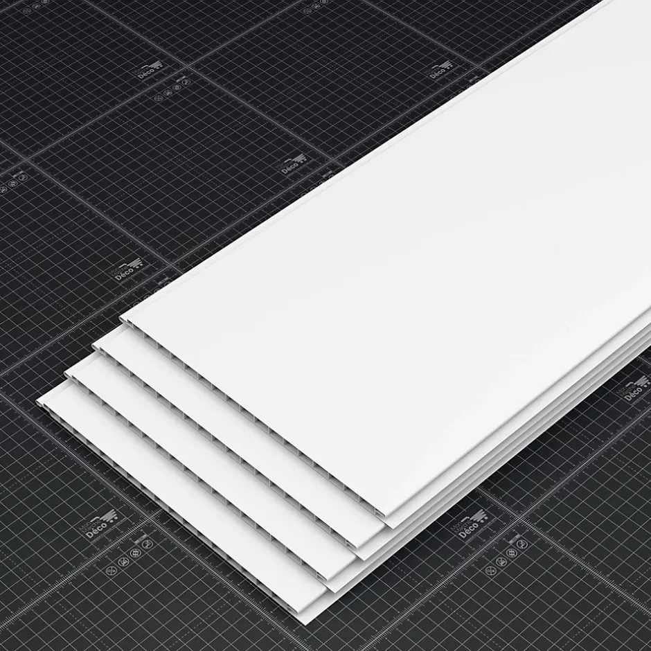 Lambris PVC blanc : l’atout de vos rénovations Notre lambris PVC blanc est le revêtement idéal de rénovation pour toutes vos pièces, du salon à la chambre, en passant la cuisine et la salle de bain. En plus de moderniser, notre lambris PVC blanc protège vos murs des chocs du quotidien. Parmi ses avantages, le PVC est un matériau très simple à nettoyer, un coup d’éponge à l’eau savonneuse suffit pour enlever toutes les tâches. Entretien facile Déco intemporelle Lot de 4 lames Le lambris PVC blanc s’installe facilement Idéal pour la rénovation, le lambris PVC est un produit à la fois résistant, esthétique et facile d’entretien. Grâce à son installation tout aussi simple, il offre un résultat propre et soigné rapidement. Pour poser le lambris PVC blanc, il suffit de clipser les lames les unes aux autres et de finir l’ouvrage avec des profils de finition d’arrêt, aussi disponibles sur Mon Marche Déco.Notre lambris PVC blanc peut s’installer dans toutes les pièces, même dans les pièces humides qui nécessite un entretien plus régulier. Les lames de lambris PVC peuvent être posées à la verticale, à l’horizontale ou bien en diagonale. Les lames que nous vendons mesurent 2,60 mètres de long. Si elles sont trop longues, elles peuvent être recoupées selon vos besoins.