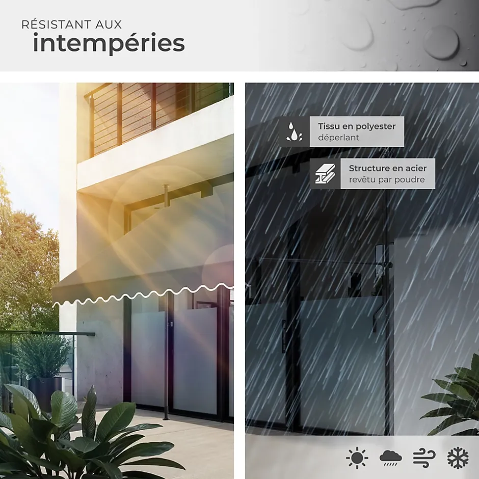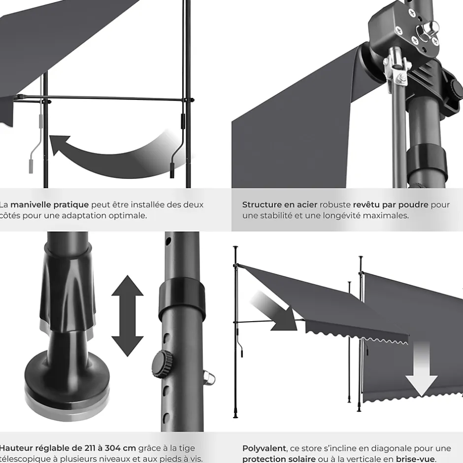 - Points Forts:Store à pince multifonctionnel avec manivelle facile à manœuvrerStructure en acier lâqué époxy avec bras en aluminium légerTiges télescopiques et pieds à visser pour un montage rapide et flexibleTissu résistant aux UV avec revêtement résistant à l’eauEmbouts en plastique antidérapants, protégeant le sol et le plafondBras de projection réglables en hauteur pour des angles d’inclinaison variablesDéployable en diagonale ou à la verticale comme brise-vueFacile à nettoyer
