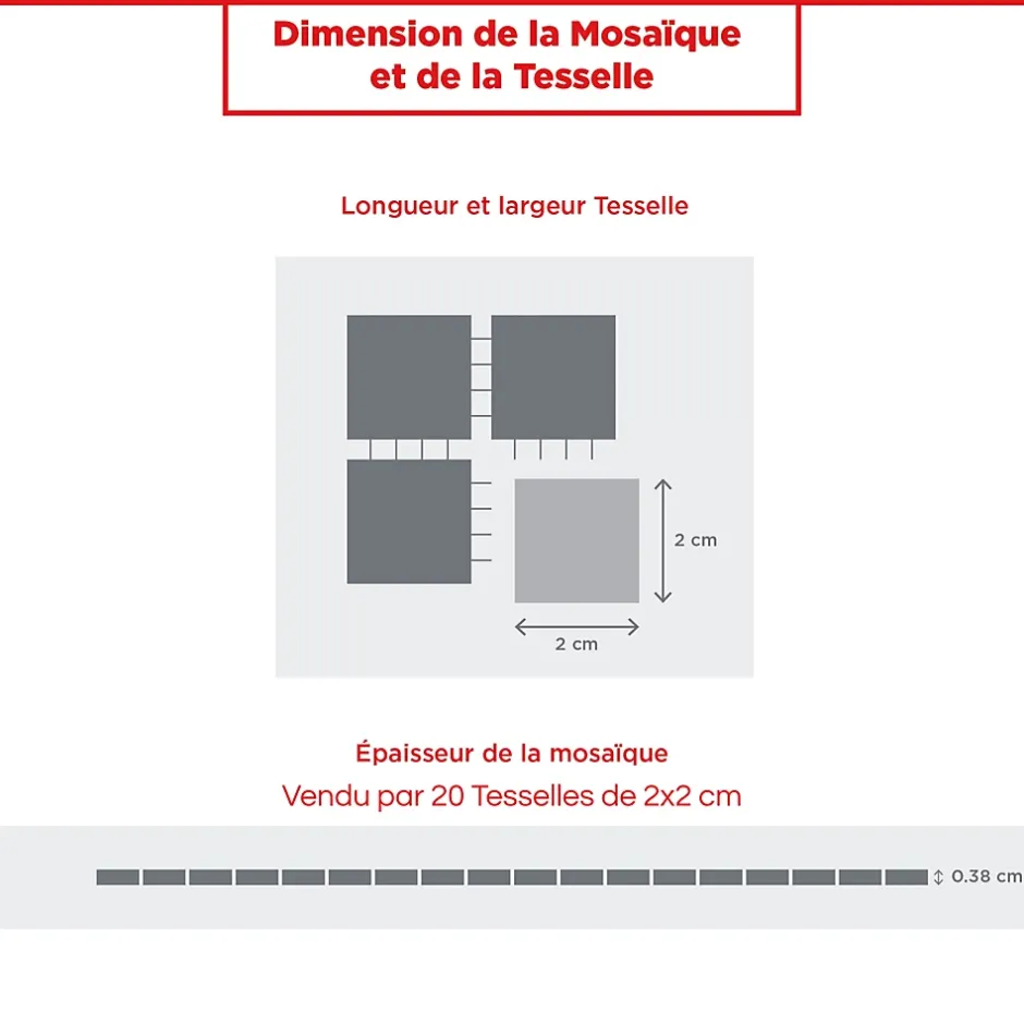 Tesselle Or Blanc/Argent Lisse Nylon Casa Linea 2x2x0.38 (Vendu par 20)Tesselle de 2×2 cm en verre recouverte d’une feuille d’or 24 carats.Couleur : Blanc / ArgentDimensions : Carreau de 2x2x0.38 cmUtilisation : MurEntretien : EauConditionnement : Vendu par lot de 20 Modalités de Livraison :Tous nos produits sélectionnés par Casa Linea sont soigneusement emballés et expédiés chaque matin dans les meilleures conditions, afin de vous apporter entière satisfaction.Vous recevrez un lien de suivi par e-mail et SMS dès le départ de votre commande depuis notre entrepôt. Nous vous invitons à surveiller régulièrement votre boîte mail, y compris vos courriers indésirables, pour ne manquer aucune information liée à la livraison.Jusqu’à la veille de la livraison, vous pourrez modifier les modalités de réception de votre commande via le lien reçu :Livraison à domicile à une autre date (jusqu’à 4 jours après la date prévue)Livraison à une autre adresseLivraison en point relaisLivraison dansun lieu sûr (à domicile dans un endroit souhaité)Retrait dans une agence de livraisonLe jour de la livraison, un suivi géolocalisé en temps réel vous permettra de suivre l’acheminement de votre colis.En cas d’absence, une nouvelle tentative sera automatiquement programmée le lendemain. Sans réponse de votre part, votre colis pourra être redirigé vers un point relais ou retourné.Ces conditions de livraison concernent les commandes inférieures à 100kg.