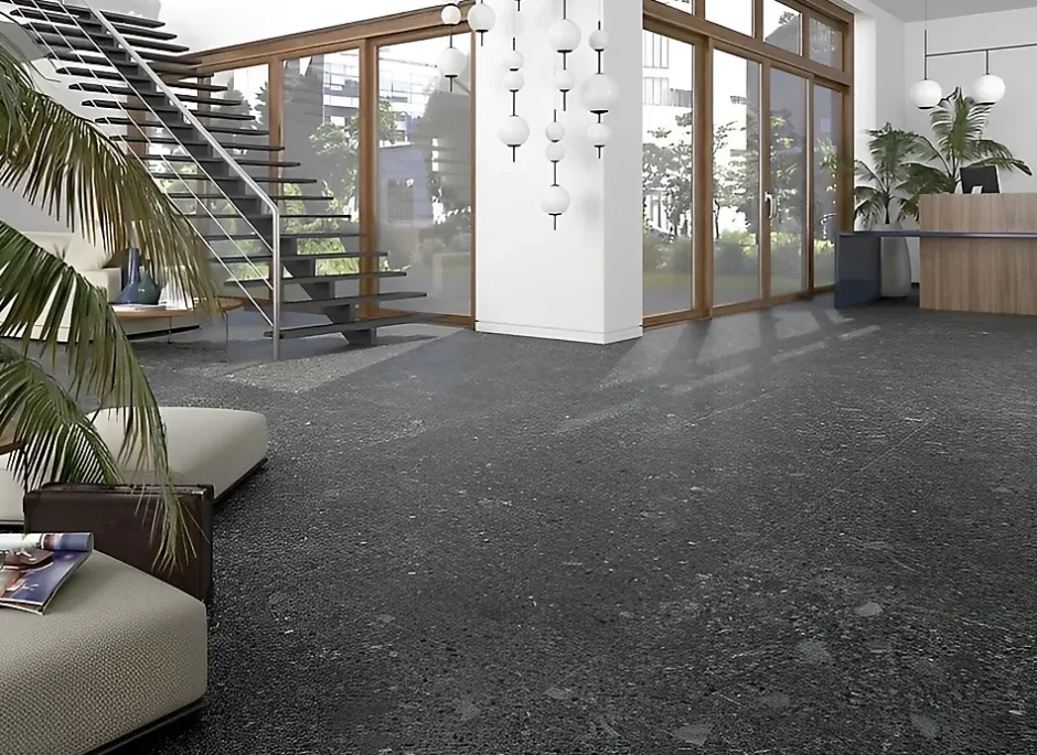 Le carrelage Straci noir 79.3 x 79.3 en grès cérame émaillé illustre bien la faculté de cette céramique à imiter d’autres matériaux. Le style est ici orienté vers l’aspect d’une pierre naturelle noir avec ses éclats de minéraux avec différentes teintes sombres.
