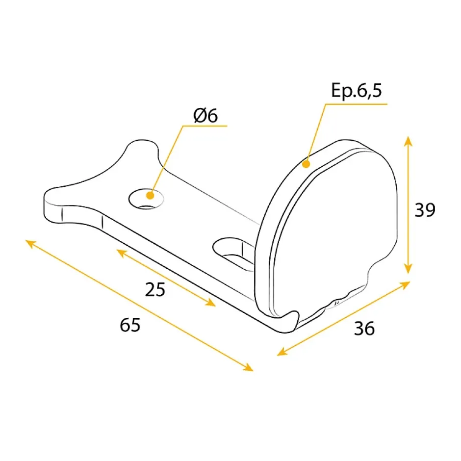 Caractéristiques techniques :- Longueur : 65 mm- Hauteur : 39 mm- Largeur : 36 mm- Entraxe : 25 mm- Diamètre de vis : 6 mm- Epaisseur : 6.5 mm- Matériaux : Composite surmoulé et aluminium- Couleur : Blanc