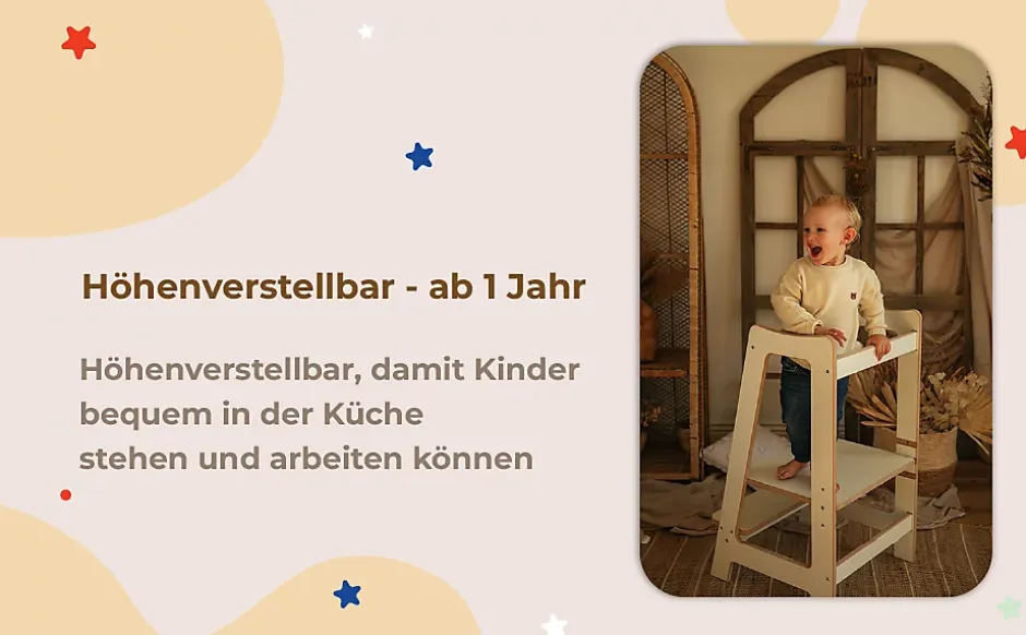 Tour d’Apprentissage – Aide-Cuisine Montessori Sûre pour Enfants CurieuxVous aimez cuisiner et souhaitez partager cette passion avec votre enfant ? Notre Tour d’Apprentissage est la solution idéale pour votre famille. Ce marchepied stable est une alternative sûre aux tabourets ou chaises de cuisine instables, permettant à votre enfant de participer activement et en toute sécurité aux activités culinaires.La Tour d’Apprentissage est un outil Montessori essentiel qui aide les enfants à découvrir le monde qui les entoure par la pratique. De la découpe des fruits au mélange des jus – la cuisine devient un lieu d’apprentissage, de découverte et de création commune.Avec sa hauteur réglable sur 3 niveaux, la tour convient aux enfants dès 1 an jusqu’à environ 5 ans. Que ce soit dans la cuisine ou la salle de bain, la Tour d’Apprentissage facilite les tâches quotidiennes et favorise l’autonomie de manière naturelle.Avantages en un coup d’œil :• Favorise l’autonomie, la créativité et la responsabilité• Soutient l’apprentissage ludique à travers des situations quotidiennes• Parfait pour la cuisine et la salle de bain – par exemple pour cuisiner ou se brosser les dents• Design scandinave – simple, moderne et intemporel• Réglable en hauteur sur 3 niveaux – adaptable et évolutifCaractéristiques techniques :- Matériau : MDF (bords non laqués, autres parties stratifiées)- Dimensions : Profondeur 40 cm, Largeur 41 cm, Hauteur 85 cm- Réglage de la hauteur : 31,5 / 36,5 / 42 cm- Montage : Montage autonome (instructions et accessoires inclus)- Sécurité : Certifié CEVeuillez ne jamais laisser votre enfant sans surveillance sur la Tour d’Apprentissage.