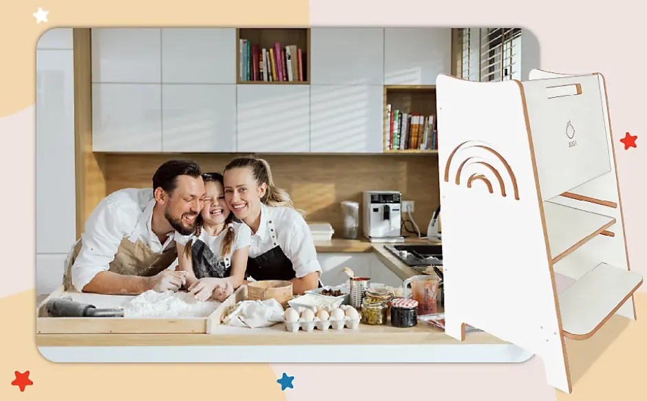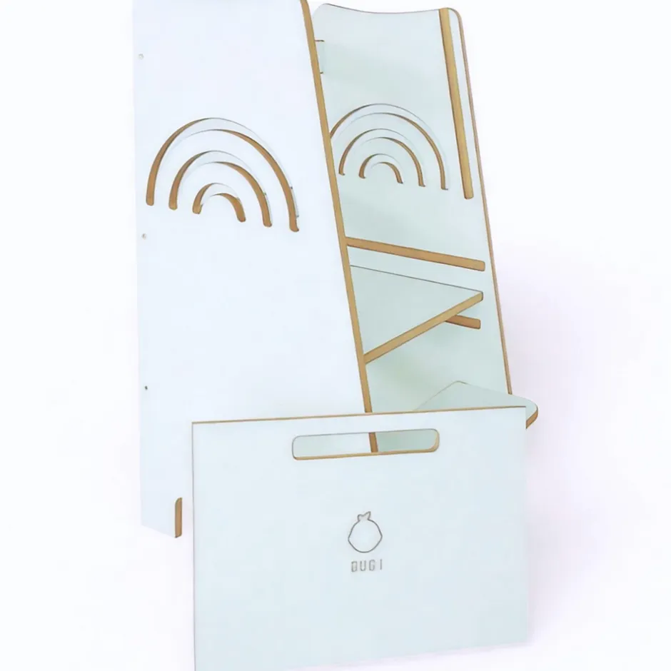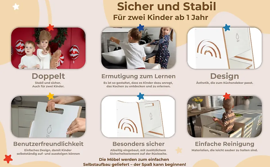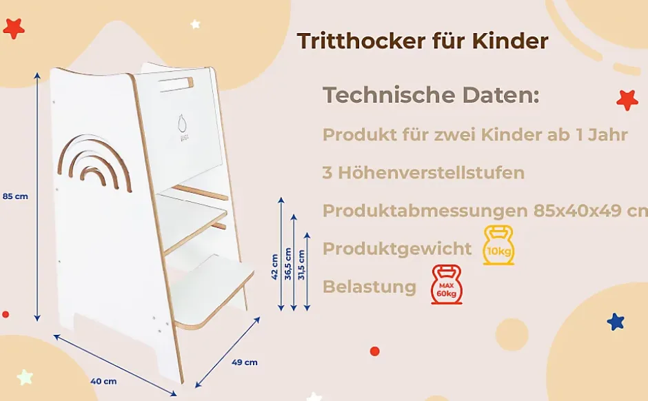 Tour d’Apprentissage Rainbow – Tour Montessori Sécurisée avec Motif Arc-en-CielLa Tour d’Apprentissage Rainbow colorée est l’assistant idéal pour les petits explorateurs en cuisine. Elle combine sécurité maximale, design fonctionnel et valeurs pédagogiques dans un meuble qui ravira les enfants et convaincra les parents.Sécurisé et stable :Grâce à sa construction stable, ses côtés fermés et son support arrière, votre enfant est protégé à tout moment. Le réglage de la hauteur sur 3 niveaux s’adapte à la croissance, de sorte que la tour accompagne l’enfant de la petite enfance jusqu’à la pré-école.Favoriser l’autonomie et la responsabilité :La Tour d’Apprentissage permet à votre enfant de se tenir seul au comptoir de la cuisine, de passer des ingrédients, d’aider à cuisiner ou de participer à la pâtisserie. Elle développe des compétences importantes du quotidien telles que la coordination, la planification et le sens des responsabilités.Design unique avec arc-en-ciel :Le motif ludique de l’arc-en-ciel non seulement met de bonne humeur, mais apporte de la couleur dans la cuisine. Le style universel s’harmonise avec de nombreux autres produits – idéal pour être combiné !Caractéristiques techniques :- Profondeur : 50 cm- Largeur : 49 cm- Hauteur : 87 cm- Matériau : MDF (bords non laqués, autres surfaces stratifiées)- Réglage de la hauteur : 3 niveaux- Montage : Montage autonome avec instructions et accessoiresAvantages du produit :• Très sécurisé – avec support arrière et côtés fermés• Réglage de la hauteur sur 3 niveaux – grandit avec l’enfant• Motif arc-en-ciel ludique – coloré et adapté aux enfants• Facile à entretenir – surface laminée, facile à nettoyer• Peut être combiné avec d’autres meubles du même styleAvec la Tour d’Apprentissage Rainbow, chaque repas devient un moment en famille rempli de joie, de créativité et d’effets d’apprentissage. Un investissement dans la sécurité, le développement et de beaux souvenirs !