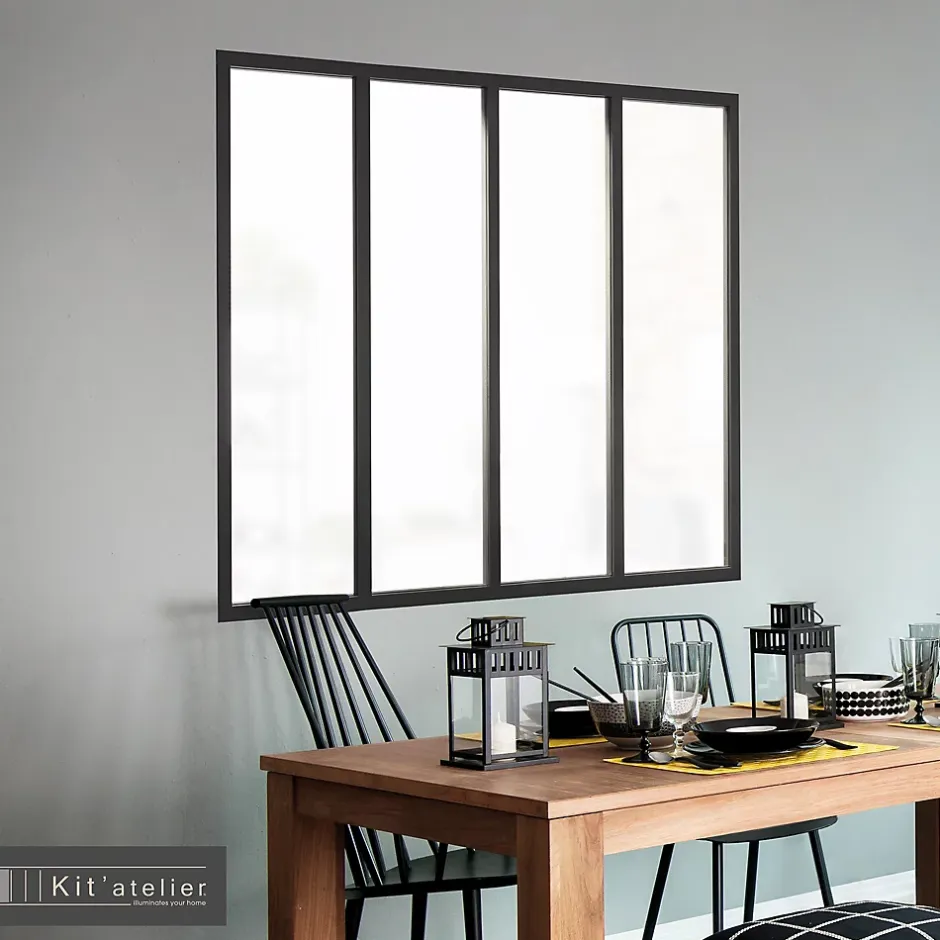 Avec sa finition aluminium thermolaqué noir sablé, la Verrière Atelier apporte une touche de style industriel chic à votre intérieur. Son ouverture haute offre une impression d’espace et invite la lumière à circuler naturellement entre les pièces. Épaisseur de profil 32 mm. Verrière de fabrication française (aluminium extrudé dans le Nord, usinage réalisée dans les Hauts-de-France), vendue en kit et facile à installer soi-même. Vitrage sécurité 4 mm inclus. Quincaillerie fournie (hors quincaillerie de fixation au mur). Pose en angle ou à flanc de mur possible (poteaux de finition et d’angle vendus séparément).