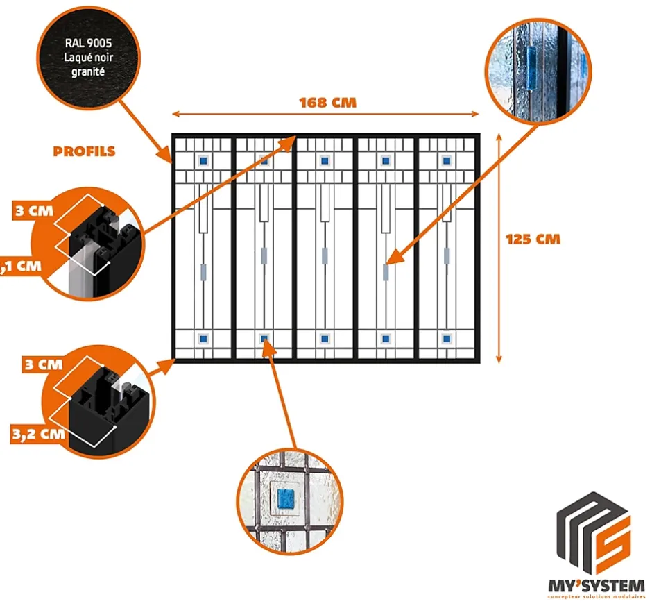 Verrière 5 verres Hudson – L x H : 168 x 125 cm – Laqué noir 9005 granité – verre Clair inclus-MySystem Hot