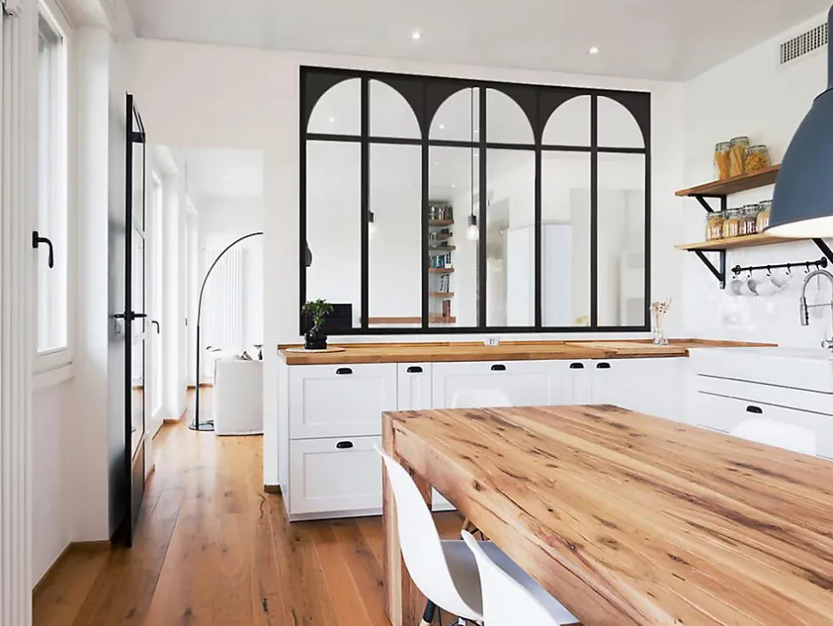 Vous souhaitez apporter un charme vintage à votre intérieur tout en gardant la luminosité ? Découvrez la verrière ARCADEA : ses courbes donneront douceur et cachet à votre intérieur ! A la fois esthétique et pratique, cette verrière d’intérieur est idéale pour différencier des espaces tout en conservant la luminosité de la pièce. Elle apporte élégance et diffuse la lumière de façon homogène. Vous aimeriez associer vos verrières ARCADEA en angle pour créer un nouvel espace ou opter pour une installation en bout de mur plutôt qu’encastrée ? Nous vous proposons également dans la même gamme les poteaux d’angle et de terminaison BAYVIEW (compatible avec le modèle ARCADEA) vous permettant de personnaliser votre espace selon vos envies.Caractéristiques Couleur (nuance) : Noir Matière (précision) : Verre trempé, Aluminium Epaisseur verre : 4 mm Epaisseur métal : 1 mm Finition : Serigraphié, Mat Nombre de vitrages : 3 Utilisation : Intérieur Gamme : Made for design À monter soi-même Epaisseur minimale du mur : 6 mmDimensions Longueur : 180 cm Hauteur : 130 cm Profondeur : 3.5 cmLivraisonLors de la livraison, il est conseillé de vérifier que le bon nombre de colis a été livré.ColisColis n°1 : Longueur 136 cm, Largeur 37 cm, Hauteur 7 cm, Poids 24 kg. Colis n°2 : Longueur 186 cm, Largeur 15 cm, Hauteur 10 cm, Poids 4 kg.