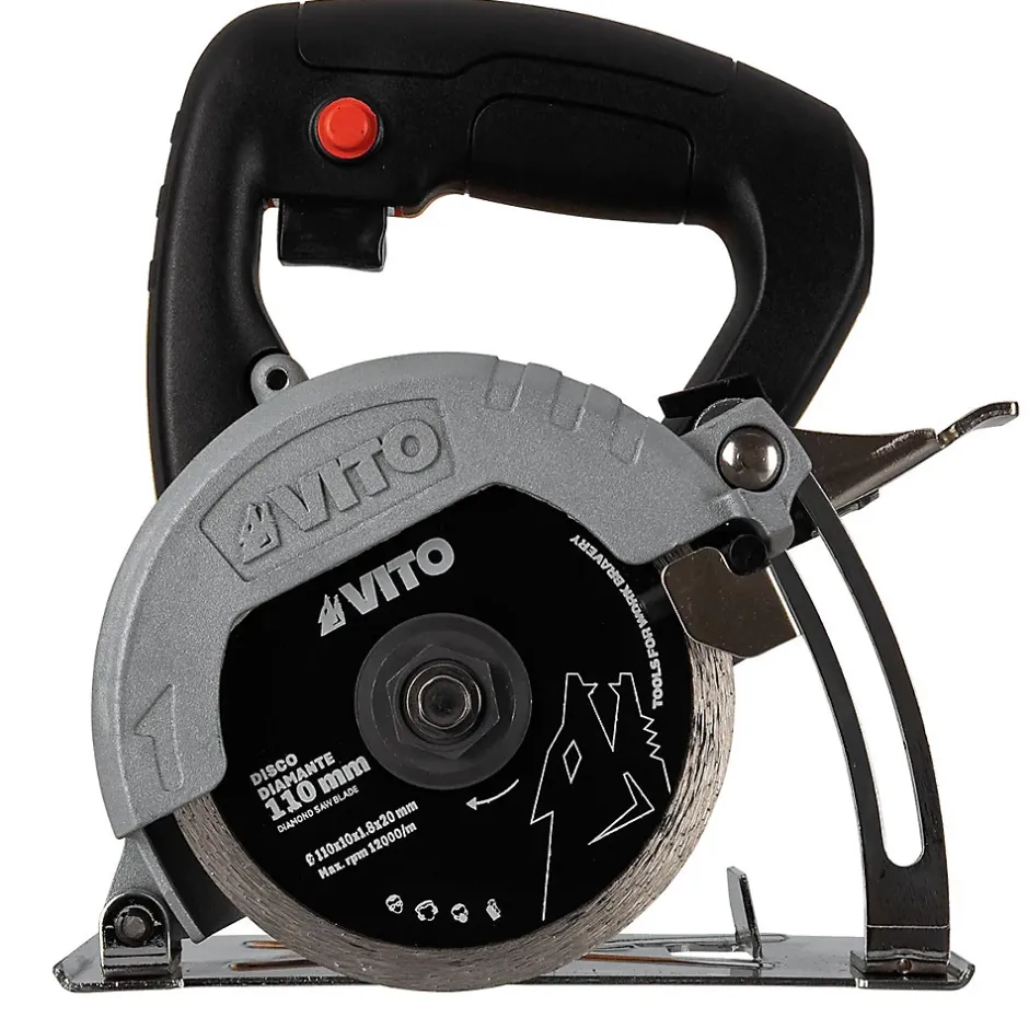 Scie circulaire à carrelage électrique VITO 1550W 230V. Carrelage, Pierre, Granit, Céramique, Marbre. Découpe carrelage avec refroidissement à eau. Tuyau 4,5 m pour le raccordement à l’eau fourni. Profondeur de coupe 34 mm avec réglage rapide. Diamètre du disque de coupe 110 mm. Alésage disque 20 mm. Épaisseur disque 1.8 mm. 12000 tours/min. Interrupteur marche/arrêt. Poignée ergonomique souple. Poids 3.5 kg.