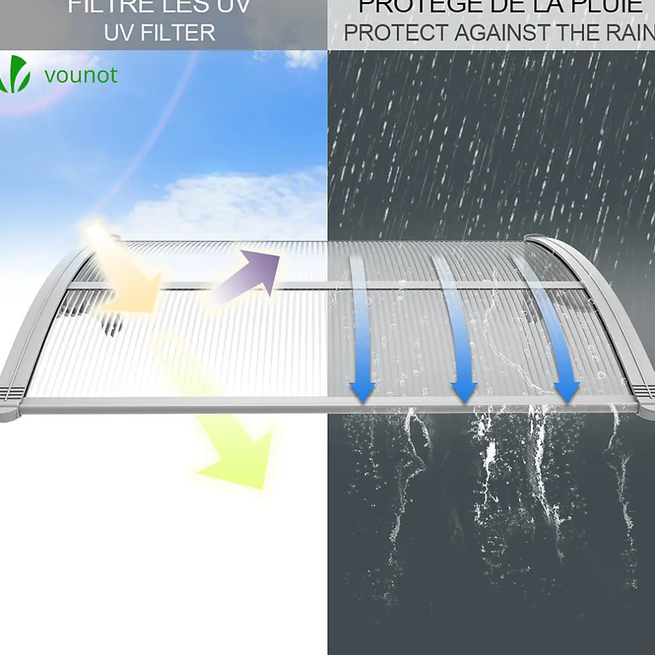 LES + PRODUITSFacile d’installationBonne protection pour les devants de porteConnexion possible de plusieurs auventsRésistant à la corrosionDESCRIPTIONFacile à installer et convient pour plusieurs endroits. Pratique pour aménager votre extérieur devant une porte d’entrée mais pas seulement.Auvent de porte en Polycarbonate, léger et stable. La plaque en polycarbonate (épaisseur de 6 mm) est résistante à la corrosion et aux chocs. Le cadre voûté en PPO est renforcé par des bandes aluminiums.Cadre voûté arrondi en plastique rigide robuste. Résistance face à la corrosion, au vent, la pluie, à la pluie et aux rayons UV, etc. Moins bruyant par temps de pluie ou de grêle.Le cadre voûté en PPO qui est résistant au feu, aux UV, à la pluie, à la neige, et aux chocs. Sa résistance aux intempéries est de l’ordre de -40 ℃ à 120 ℃.La conception ondulée du cadre de support multipoint fournit trois points de support de style européen.Le cadre est renforcé par des bandes d’extrémités en aluminium. La stabilité de l’aluminium, la résistance à l’oxydation et la bonne ductilité de l’aluminium permettent à la voile de résister aux vents violents et aux fortes pluies.CARACTÉRISTIQUESEpaisseur de plaque : 6mmTailles Disponibles : 200CM*80CM ; 120CM*80CM ; 100CM*80CMMatériaux : Polycarbonate, AluminiumA fixer au murConforme aux normes de sécurité en vigueur dans l’UEIMPORTANT :Les livraisons se font en France métropolitaine à l’exception des îles qui ne sont pas reliées au continent par un pont (Corse, Ile d’Yeux etc.) et des DOM-TOM.