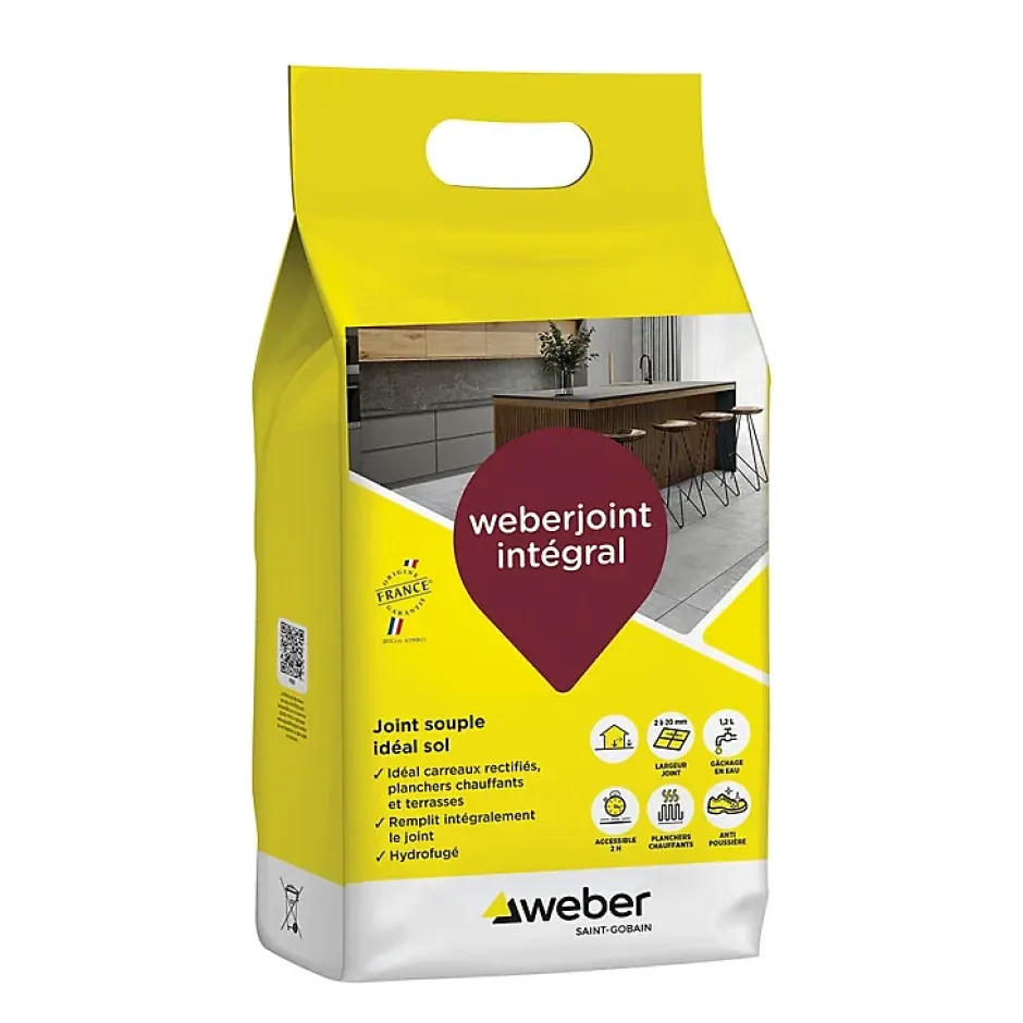 – Mortier pour joints de carrelage WEBER JOINT INTEGRAL – Coloris : différents coloris selon nuancier- Matière : poudre – Facile à appliquer- Permet la réalisation de joints de carrelages de 2 à 20 mm de large- Sspécialement recommandé pour les carreaux rectifiés, planchers chauffants et terrasses – Utilisable sur supports muraux intérieurs et sur sols intérieurs et extérieurs- Rempli intégralement le joint- jOINT SOUPLE- Hydrofugé- Nettoyage facile- Durée pratique d’utilisation : 45 minutes- Délai de mise en circulation : 24 heures -Délai avant jointoiement en pose scellée : 3 à 5 jours- Température d’emploi : de +5 °c à +35 °c- Ne pas utiliser en façade- Ne pas utiliser dans les locaux soumis à une utilisation intensive et à des nettoyages fréquents (cuisines, douches collectives, piscines…)- Ne pas utiliser dans les locaux soumis aux eaux sous pression et à des produits agressifs- Ne pas utiliser en piscine – Origine France Conditionnement et Poids :- Sac de 5 kg ou 25 kg selon le modèle Autres données : – Composition : ciment blanc, résine en poudre redispersable, sables siliceux, dhydrofuge et pigments – Normes : Classement A+ pour emission dans l’aire intérieur