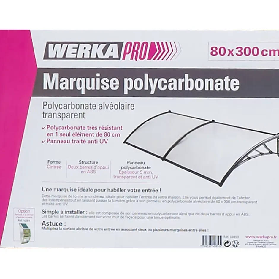 Description détaillée du produit: Produit: marquise Utilisation: protection entrée de la maison Matière: polycarbonate Plusieurs dimensions disponibles Nombre de panneaux: 2 panneaux Installation facile: Profilés en U percés, redirigeant l’eau de pluie vers les côtés. Dimensions d’un panneau: 80 x 120 cm pour 240cm / 80 x 150 cm pour 300cm Épaisseur: 5 mm Entraxe de 15cm Caractéristiques: polycarbonate alvéolaire / transparent / traitement anti UV Forme: cintrée Structure: 3 barres d’appui en ABS Hauteur des fixations: 28 cm Marque: WERKA PRO