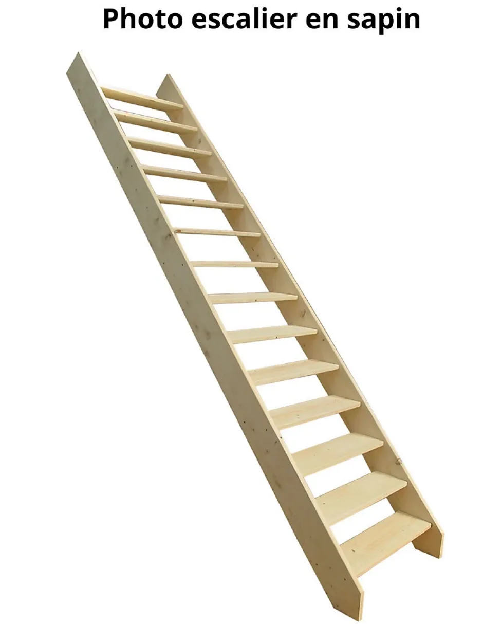 Escalier droit en sapin (195 x 34 mm) livré en kit, hauteur 220 cm. 14 marches, largeur De 60 à 90 cm (hors rampe). Disponible avec ou sans rampe.
