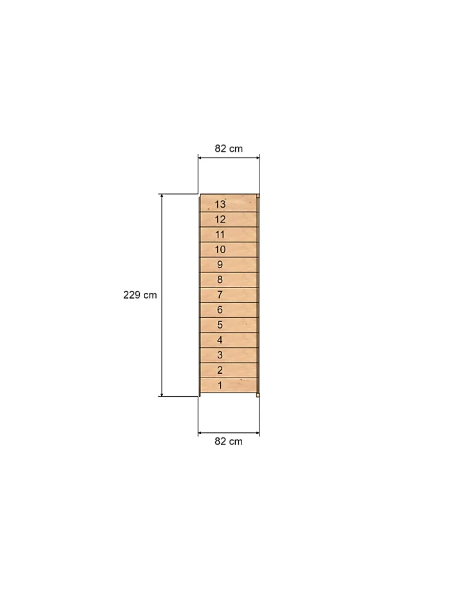 Escalier droit livré en kit, hauteur 280 cm. 12 marches, largeur 80 cm sans rampe / 82 cm avec rampe. Disponible avec ou sans contremarches et rampe.